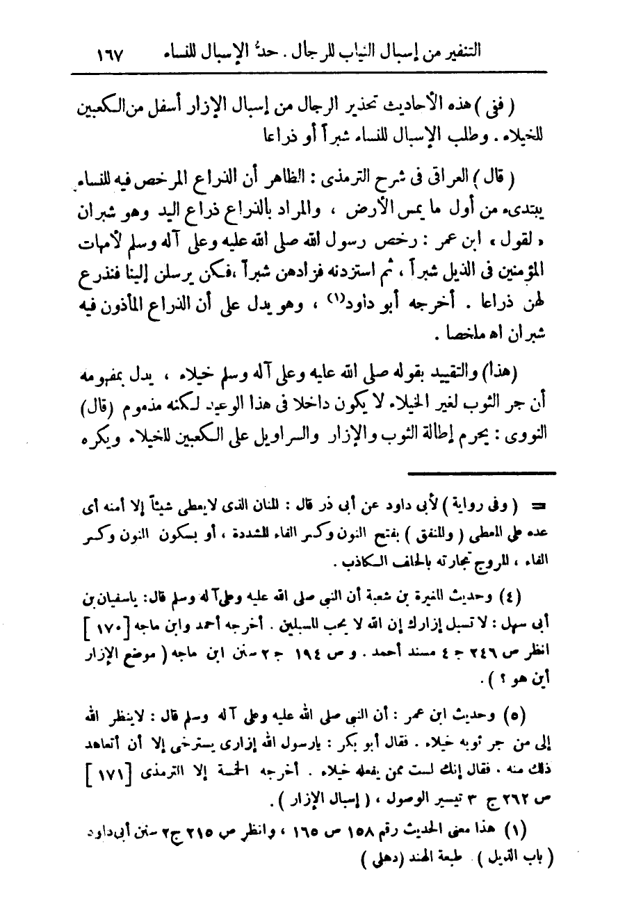 وحديث المغيرة بن شعبة أن النبى صلى الله عليه وسلم قال: يا سفيان بن ابى سهل: لا تسبل إزارك إن الله لا يحب المسبلين. أخرجه أحمد وابن ماجه {170} انظر ص 246 ج 4 مسند أحمد. وص 194 جـ 2 سنن ابن ماجه (موضع الإزار اين هو؟ ).