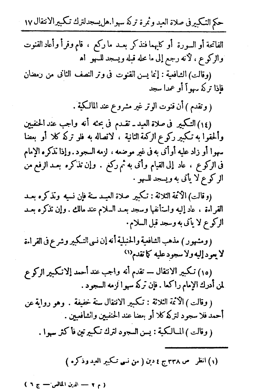 (14) التكبير فى صلاة العيد - تقدم فى بحثه أنه واجب عند الحنفيين وألحقوا به تكبير ركوع الركعة الثانية، لاتصاله به فلو تركه كلا أو بعضا سهوا أو زاد عليه أو أتى به فى غير موضعه، لزمه السجود. وإذا تذكره الإمام فى الركوع، عاد إلى القيام وأتى به ثم ركع. وإن تذكره بعد الرفع من الركوع لا يأتي به ويسجد للسهو.