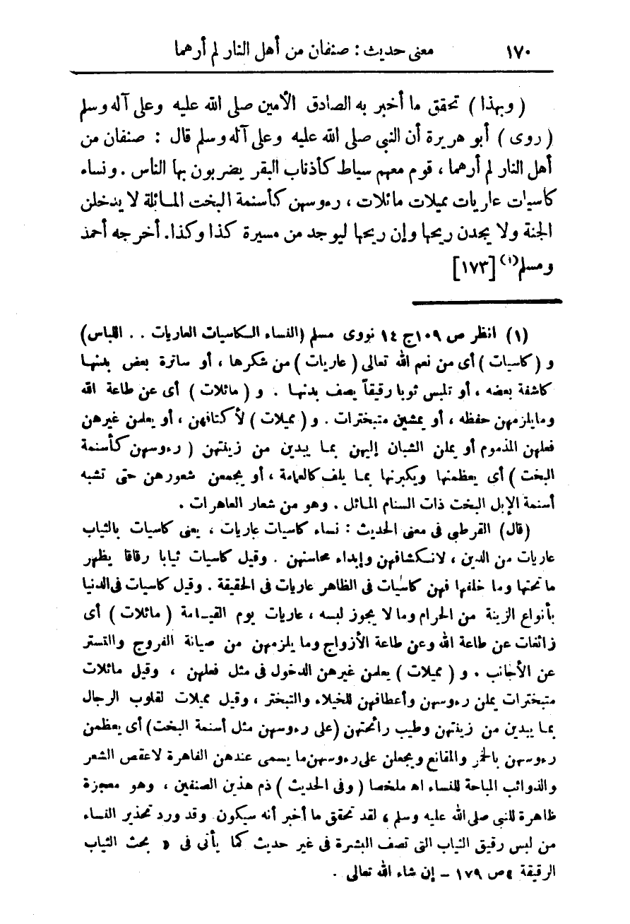 (¬1) انظر ص 109 ج 14 نووى مسلم (النساء الكاسيات العاريات .. اللباس) و (كاسيات) أى من نعم الله تعالى (عاريات) من شكرها، أو ساترة بعض بنسها كاشفة بعضه، أو تلبس ثوبا رقيقا يصف بدنها. و (مائلات) أى عن طاعة الله وما يلزمهن حفظة، أو يمشين متبخترات. و (مميلات) لأكتافهن، أو يعلمن غيرهن فعلهن المذموم أو يملن الشبان إليهن بما يبدين من زينتهن (رءوسهن كاسنمة البخت) أى يعظمنها ويكبرنها بما يلف كالعمامة، أو يجمعن شعورهن حتى تشبه اسنمة الإبل البخت ذات السنام المائل. وهو من شعار العاهرات.