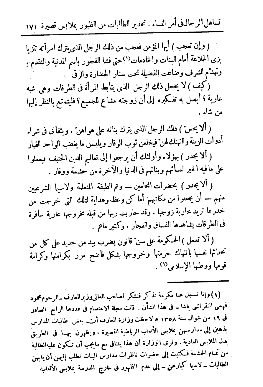 (ألا يجدر) بحضرات المحامين - وهم الطبقة المتعلمة ولاسيما الشرعيين منهم - أن يجعلوا من مكاتبهم أماكن وعظ وهداية لتلك التى خرجت من خدرها تريد محاربة زوجها، وقد حاربت ربها من قبله بخروجها عارية سافرة فى الطرقات يشاهدها الفساق والفجار، وكثير ماهم.