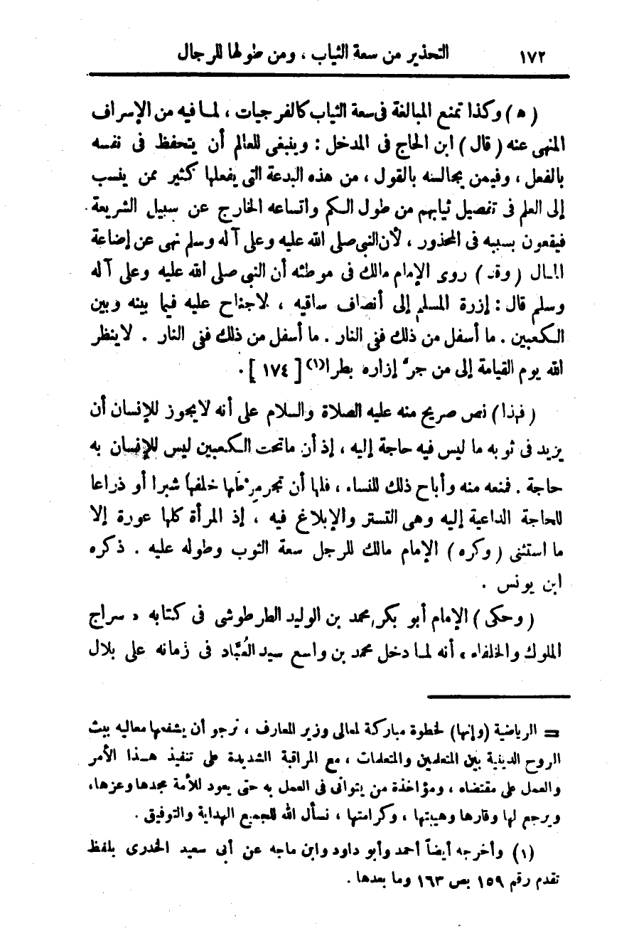 (هـ) وكذا تمنع المبالغة فى سعة الثياب كالفرجيات، لما فيه من الإسراف المنهى عنه (قال) ابن الحاج فى المدخل: وينبغى للعالم أن يتحفظ فى نفسه بالفعل، وفيمن يجالسه بالقول، من هذه البدعة التى يفعلها كثير ممن ينسب إلى العلم فى تفصيل ثيابهم من طول الكم واتساعه الخارج عن سبيل الشريعة فيقعون بسببه فى المحذور، لأن النبى صلى الله عليه وعلى آله وسلم نهى عن إضاعة المال (وقد) روى الإمام مالك فى موطئه أن النبى صلى الله عليه وعلى آله وسلم قال: إزرة المسلم إلى أنصاف ساقيه، لا جناح عليه فيما بينه وبين الكعبين. ما أسفل من ذلك ففى النار. ما أسفل من ذلك ففى النار. لا ينظر الله يوم القيامة الى من جر إزاره بطرا (¬1) {174}.