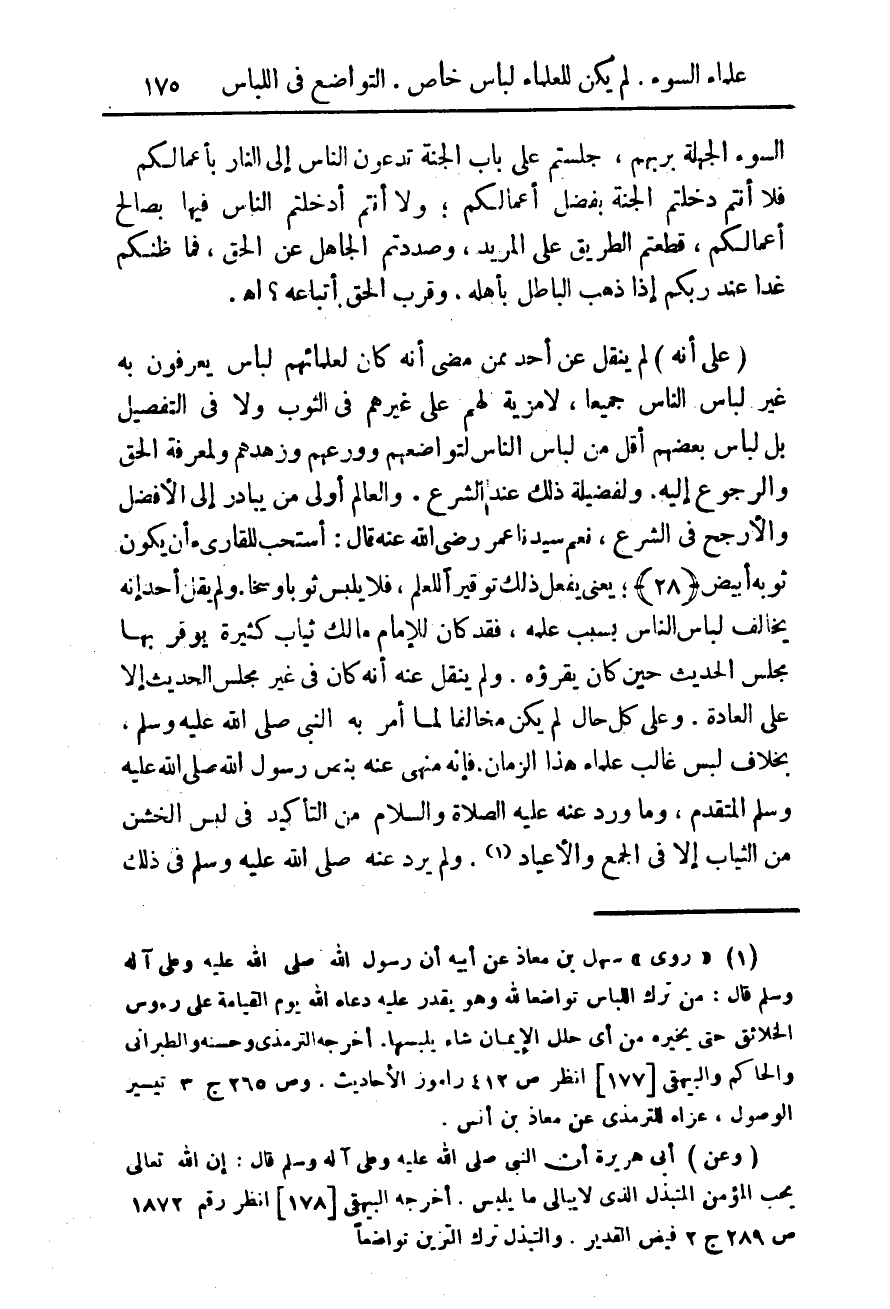 (على أنه) لم ينقل عن أحد ممن مضى أنه كان لعلمائهم لباس يعرفون به غير لبأس الناس جميعا، لامزية لهم على غيرهم فى الثوب ولا فى التفصيل بل لباس بعضهم أقل من لباس الناس لتواضعهم وورعهم وزهدهم ولمعرفة الحق والرجوع إليه. ولفضيلة ذلك عند الشرع. والعالم أولى من يبادر إلى الأفضل والرجح فى الشرع، نعم سيدنا عمر رضى الله عنه قال: استحب للقارئ أن يكون ثوبه أبيض {28} يعنى يفعل ذلك توقيراً للعلم، فلا يلبس ثوبا وسخا ولم يقل أحد إنه يخالف لباس الناس بسبب علمه، فقد كان للإمام ثياب كثيرة يوقر بها مجلس الحديث حين كان يقرؤه. ولم ينقل عنه أنه كان فى غير مجلس الحديث إلا على العادة. وعلى كل حال لم يكن مخالفا لما امر به النبى صلى الله عليه وسلم، بخلاف لبس غالب علماء هذا الزمان. فإنه منهى عنه بنص رسول الله صلى الله عليه وسلم المتقدم، وما ورد عنه عليه الصلاة والسلام من التأكيد فى لبس الخشن من الثياب إلا فى الجمع والأعياد (¬1).