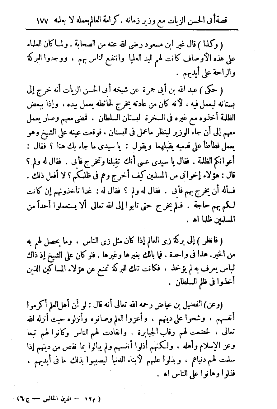 (فأنظر) إلى بركة زى العالم إذا كان مثل زى الناس، وما يحصل لهم به من الخير. هذا فى واحدة. فما بالك بغيرها وغيرها. فلو كان على الشيخ إذ ذاك لباس يعرف به لم يؤخذ، فكانت تلك البركة تمنع عن هؤلاء المساكين الذين أخذوا فى ظلم السلطان.