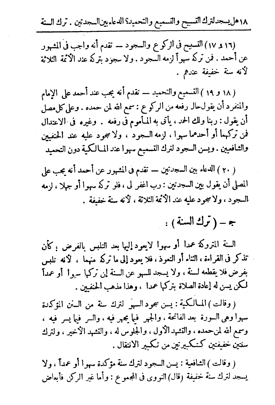 (16 و 17) التسبيح فى الركوع والسجود - تقدم أنه واجب فى المشهور عن أحمد. فمن تركه سهوا لزمه السجود. ولا سجود بتركه عند الأئمة الثلاثة لنه سنة خفيفة عندهم.