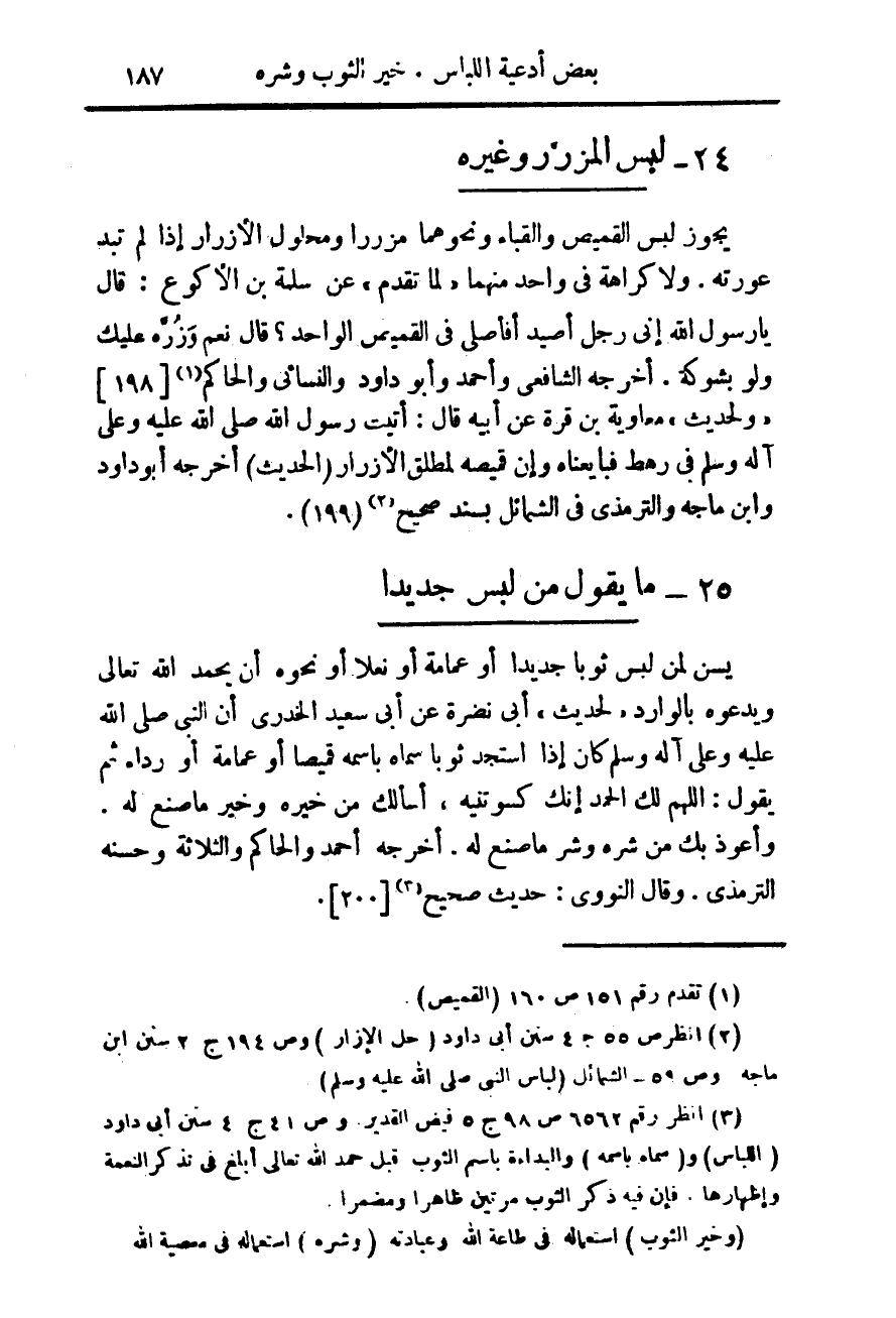 (¬2) (انظر ص 55 جـ 4 سنن ابى داود - حل الإزار) وص 194 ج 2 سنن ابن ماجه وص 59 الشمائل (لباس النبى صلى الله عليه وسلم)