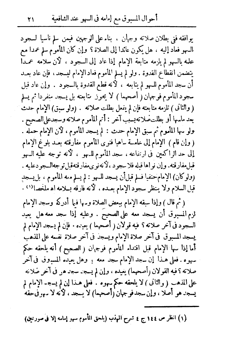 (¬1) انظر ص 144 ج 4 شرح المهذب (يلحق الماموم سهو إمامه إلا فى صورتين)