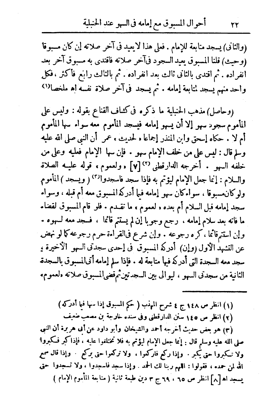 (وحاصل) مذهب الحنبلية ما ذكره فى كشاف القناع بقوله: وليس على المأموم سجود سهو إلا أن يسهو إمامه فيسجد المأموم معه سواء سها المأموم أم لا. حكاه إسحق وابن المنذر إجماعا " لحديث " عمر أن النبى صلى الله عليه وسلم قال: ليس على من خلف الإمام سهو. فإن سها الإمام فعليه وعلى من خلفه السهو. أخرجه الدار قطنى (¬2) (7) " ولعموم " قوله عليه الصلاة والسلام: إنما جعل الإمام ليؤتم به فإذا سجد فاسجدوا (¬3) (ويسجد) المأموم ولو كان مسبوقا، سواء كان سهو إمامه فيما أدركه المسبوق معه أم قبله، وسواء سجد إمامه قبل السلام أم بعده " لعموم " ما تقدم. فلو تقدم. فلو قام المسبوق لقضاء ما فاته بعد سلام إمامه. رجع وجوبا إن لم يستتم قائما، فسجد معه لسهوه، وإن استنم قائما، كره رجوعه. وإن شرع فى القراءة حرم رجوعه كما لو نهض عن التشهد الأول (وإن) أدركه المسبوق فى إحدى سجدتى السهو الأخيرة، سجد معه السجدة التى أدركه فيها متابعة له.