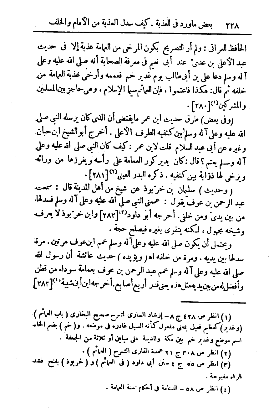 (¬1) انظر ص 428 ج 8 - ارشاد السارى لشرح صحيح البخارى (باب العمائم) (وغدير) كعظيم فعيل بمعنى مفعول كأنه السيل غادره فى موضعه. و (خم) بضم الخاء اسم موضع وغدير خم بين مكه والمدينة على ميلين أو ثلاثة من الجحفة.