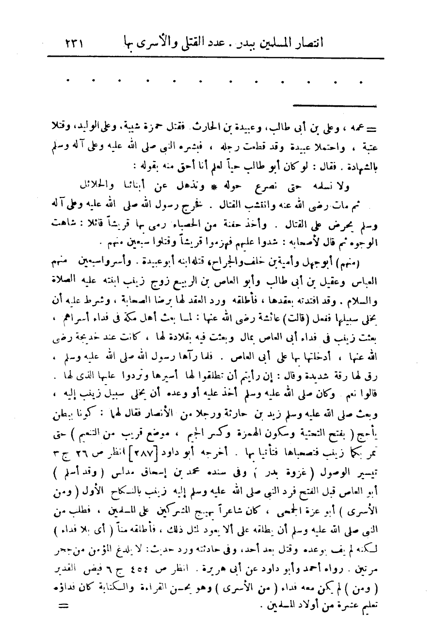 (منهم) ابو جهل وأمية بن خلف والجراح، قتله ابنه ابو عبيدة. وأسروا سبعين منهم العباس وعقيل بن ابى طالب وابو العاص بن الربيع زوج زينب ابنته عليه الصلاة والسلام. وقد افتدته بعقدها. فأطلقه ورد العقد لها برضا الصحابه. وشرط عليه أن يخلى سبيلها ففعل (قالت) عائشة رضى الله عنها: لما بعث اهل مكة فى فداء اسراهم بعثت زينب فى فداء ابى العاص بمال وبعثت فيه بقلادة لها، كانت عند خديجة رضى الله الله عنها، أدخلتها بها على ابى العاص. فلما رآها رسول الله صلى الله عليه وسلم رق لها رقه شديدة وقال: إن رايتم أن تطلقوا لها أسيرها وتردوا عليها الذى لها قالوا نعم وكان صلى الله عليه وسلم أخذ عليه أو وعده أن يخلى سبيل زينب اليه، وبعث صلى الله عليه وسلم زيد بن حارثة ورجلا من الأنصار فقال لهما: كونا ببطن يأحج (بفتح التحتية وسكون الهمرز وكسر الجيم، موضع قريب من التنعيم) حتى تمر بكما زينب فتصحباها فتأتيا بها. أخرجه ابو داود] 287 [انظر ص 26 ج 3 تيسير الوصول (غزوة بدر) وفى سنده محمد بن إسحاق مدلس (وقد اسلم) ابو العاص قبل الفتح فرد النبى صلى الله عليه وسلم اليه زينب بالنكاح الأول (ومن الأسرى) أبو عزة الجمحى، كان شاعرا بهيج المشركين على المسلمين، فطلب من النبى صلى الله عليه وسلم أن يطلقه على الأ يعود لمثل ذلك. فأطلقه منا (أى بلا فداء) لكنه لم يف بوعده وقتل بعد أحد، وفى حادثته ورد حديث: لا يلدغ المؤمن من جحر مرتين. رواه أحمد وأبو داود عن أبى هريرة. انظر ص 454 ج 6 فيض القدير