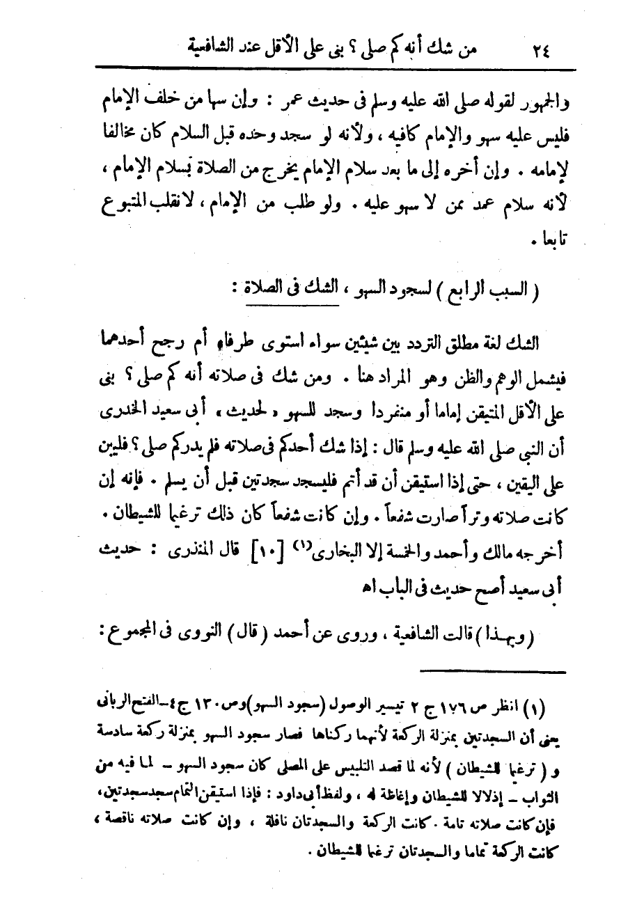 الشك لغه مطلق التردد بين شيئين سواء استوي طرفاه أم رجح أحدهما فيشمل الوهم والظن وهو المراد هنا. ومن شك في صلاته أنه كم صلي؟ بني علي الأقل المتيقن إماما أو منفردا وسجد للسهو " لحديث " أبى سعيد الخدري أن النبي صلي الله عليه وسلم قال: إذا شك أحدكم في صلاته فلم يدركم صلي؟ فليبن علي اليقين ,حتي إذا استيقن أن قد أتم فليسجد سجدتين قبل أن يسلم. فإنه إن كانت صلاته وتراً صارت شفعاً. وأن كانت شفعاً كان ذلك ترغيما للشيطان. أخرجه مالك واحمد والخمسه إلا البخاري (¬1) {10} قال المنذري: حديث أبى سعيد أصح حديث في الباب أهـ.