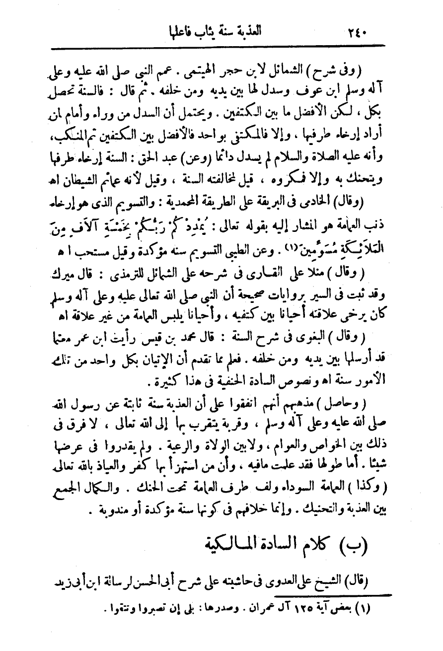 (وكذا) العمامة السوداء ولف طرف العمامة تحت الحنك. والكمال الجمع بين العذبة والتحنيك. وإنما خلافهم فى كونها سنة مؤكدة أو مندوبة.