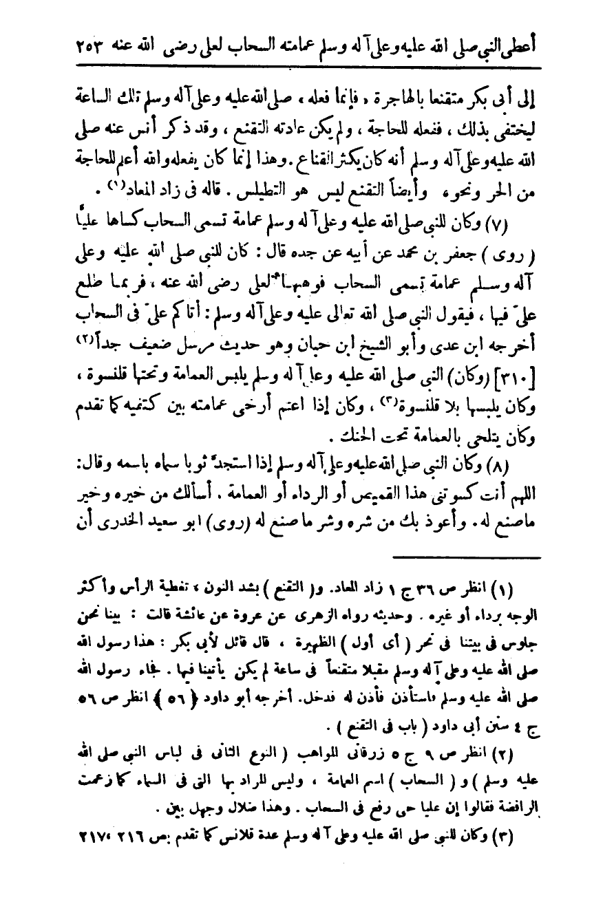 (¬2) انظر ص 9 ج 5 زرقانى المواهب (النوع الثانى فى لباس النبى صلى الله عليه وسلم) و (السحاب) اسم العمامة، وليس المراد بها التى فى السماء كما زعمت الرافضة فقالوا إن عليا حى رفع فى السحاب. وهذا ضلال وجهل بين.