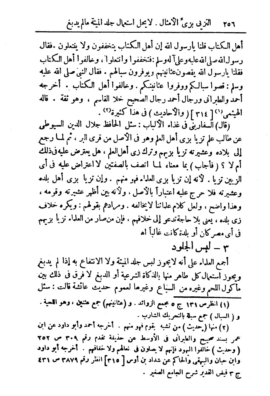 أهل الكتاب قلنا يا رسول الله أهل الكتاب يتخففون ولا ينتعلون. فقال رسول الله صلى الله عليه وسلم: فتخففوا وانتعلوا، وخالفوا أهل الكتاب فقلنا يا رسول الله يقصون عثانينهم ويوفرون سبالهم. فقال النبى صلى الله عليه وسلم: قصوا سبالكم ووفروا عثانينهم وخالفوا أهل الكتاب. أخرجه أحمد والطبرانى ورجال أحمد رجال الصحيح خلا القاسم، وهو ثقة. قاله الهيثمى (¬1) ({314} والأحاديث) فى هذا كثيرة (¬2).