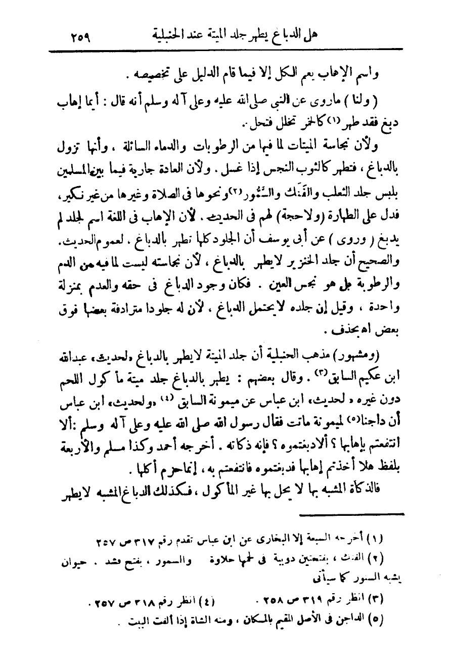 (ومشهور) مذهب الحنبلية أن جلد الميتة لا يطهر بالدباغ " لحديث " عبد الله ابن عكيم السابق (¬3). وقال بعضهم: يطهر بالدباغ جلد ميتة مأكول اللحم دون غيره " لحديث " ابن عباس عن ميمونة السابق (¬4) " ولحديث " ابن عباس أن داجنا (¬5) لميمونة ماتت فقال رسول الله صلى الله عليه وسلم: ألا انتفعتم بإهابها؟ الادبغتموه؟ فإنه ذكاته. أخرجه أحمد وكذا مسلم والأربعة بلفظ هلا أخذتم إهابها قد بغتموه فانتفعتم به، إنما حرم أكلها.