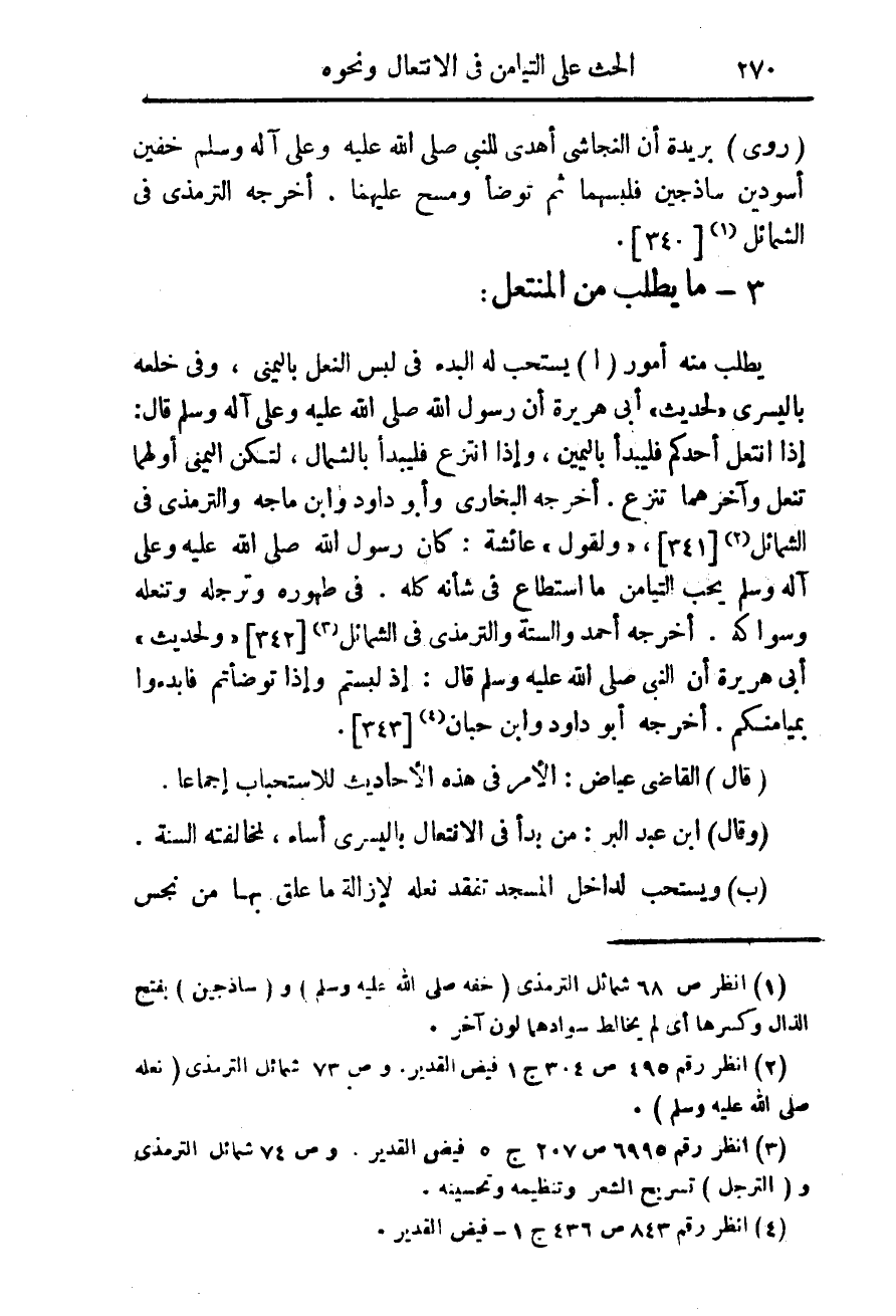 ما يطلب منه أمور (أ) يستحب له البدء فى لبس النعل باليمنى، وفى خلفه باليسرى " لحديث " ابى هريرة أن رسول الله صلى الله عليه وعلى آله وسلم قال: إذا انتعل أحدكم فليبدأ باليمين، وإذا انتزع فليبدأ بالشمال، لتكن اليمنى أولهما تنعل وآخرهما تنزع. أخرجه البخارى وأبو داود وابن ماجه والترمذى فى الشمائل (¬2) {341} " ولقول " عائشة: كان رسول الله صلى الله عليه وعلى آله وسلم يحب التيامن ما ستطاع فى شانه كله. فى طهورة وترجله وتنعله وسواكه. أخرجه أحمد والستى والترمذى فى الشمائل (¬3) {342} " ولحديث " ابى هريرة أن النبى صلى الله عليه وعلى آله وسلم قال: إذ لبستم وإذا توضأتم فابدءوا بميامنكم. أخرجه ابو داود وابن حبان (¬4) {343}.