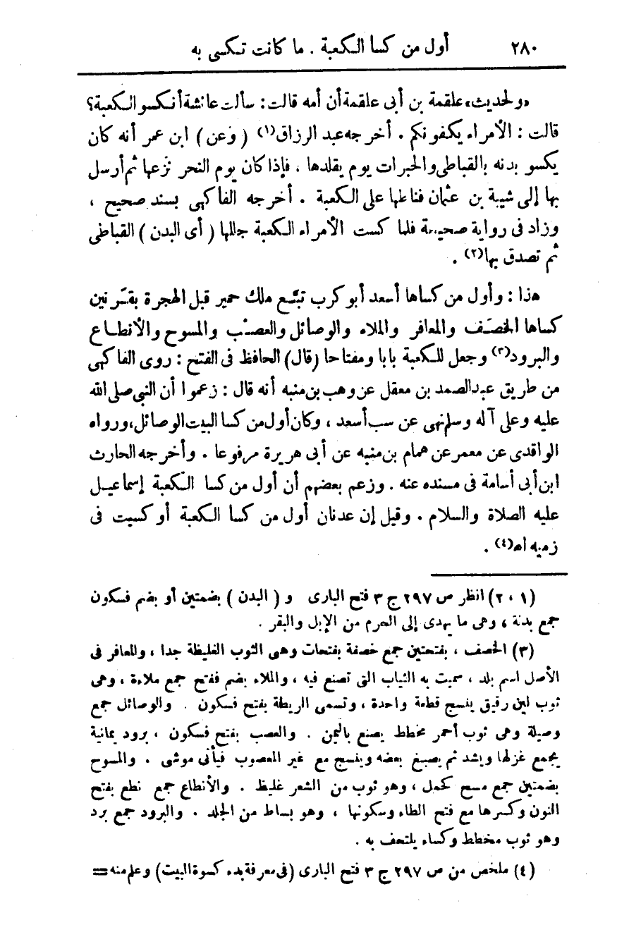 (¬4) ملخص من ص 297 ج 3 فتح البارى (فى معرفة بدء كسوة البيتث) وعلم منه إن فى أول من كساها ثلاثة اقوال: تبع ملك حمير وإسماعيل وعدنان فإن ثبتت فيجمع بينها بأن غسماعيل أول من كساها مطلقا، وأما تبع فاول من كساها الأنطاع والوصائل، وأما عدنان فعله أول من كساها بعد اسماعيل.