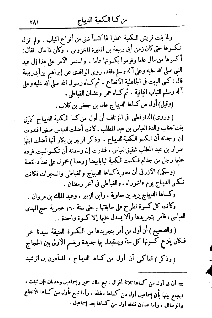 (وحكى) الأرزاقى أن معاوية كساها الديباج والقباطى والحبرات فكانت تكسى الديباج يوم عاشوراء، والقباطى فى آخر رمضان.