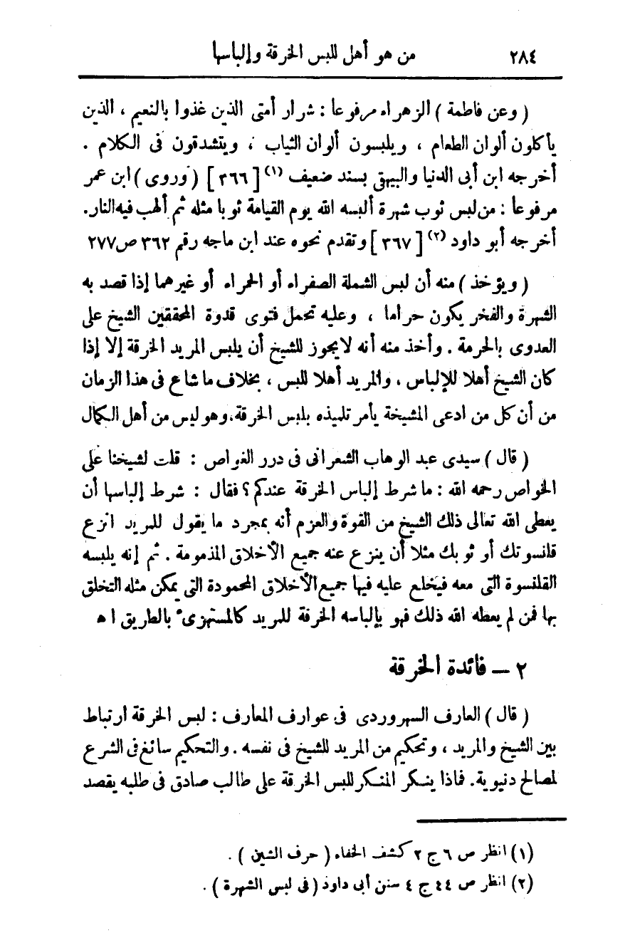 (ويؤخذ) منه أن لبس الشملة الصفراء أو الحمراء أو غيرهما إذا قصد به الشهرة والفخر يكون حراما، وعليه تحمل فتوى قدوة المحققين الشيخ على العدوى بالحرمة. وأخذ منه أنه لا يجوز للشيخ أن يلبس المريد الخرقة إلا إذا كان الشيخ أهلا للإلباس، والمريد أهلا للبس، بخلاف ما شاع فى هذا الزمان من أن كل من أدعى المشيخة يأمر تلميذه بلبس الخرقة، وهو ليس من أهل الكمال.