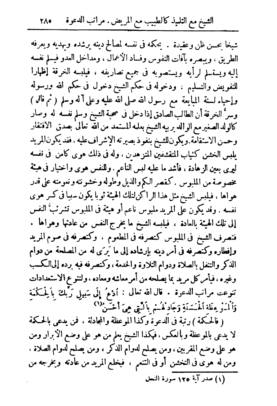 (فالحكمة) رتبة فى الدعوة وكذا الموعظة والمجادلة، فمن يدعى بالحكمة لا يدعى بالموعظة وبالعكس ن فهكذا الشيخ يعلم من هو على وضع الأبرار ومن هو على وضع المقربين، ومن يصلح لدوام الذكر، ومن يصلح لدوام الصلاة، ومن له هوى فى التخشن أو فى التنعيم، فيخلع المريد من عادته ويخرجه من