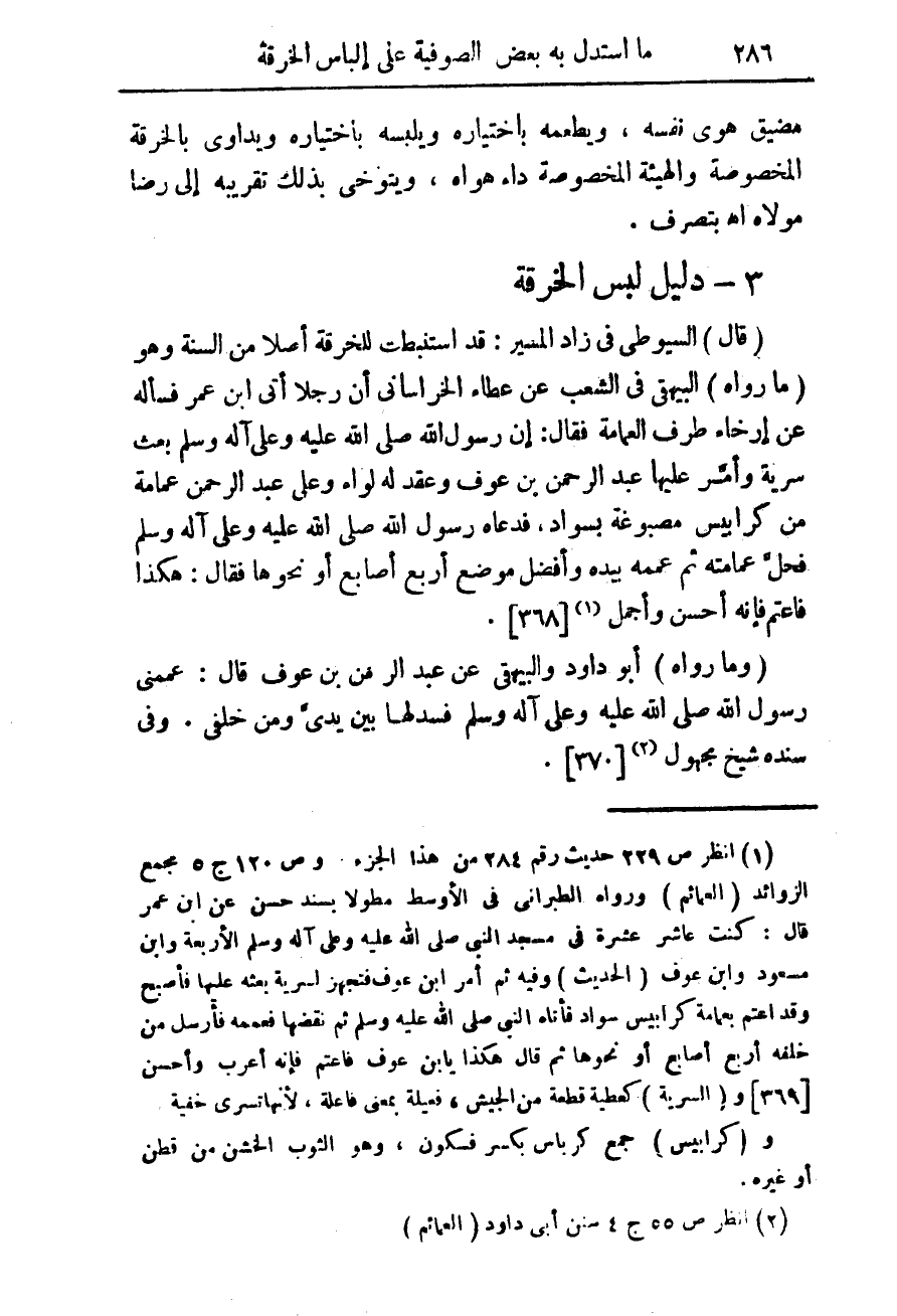 (قال) السيوطى فى زاد المسير: قد استنبطت للخرقة أصلا من السنة وهو (ما رواه) البيهقى فى الشعب عن عطاء الخراسانى أن رجلا أتى ابن عمر فساله عن إرخاء طرف العمامة فقال: إن رسول الله صلى الله عليه وسلم بعث سرية وأمر عليها عبد الرحمن بن عوف وعقد له لواء وعلى عبد الرحمن عمامة من كرابيس مصبوغة بسواد، فدعاه رسول الله صلى الله عليه وسلم فحل عمامته ثم عممه بيده وأفضل موضع اربع اصابع أو نحوها فقال: هكذا فاعتم فإنه أحسن وأجمل (¬1) {368}.