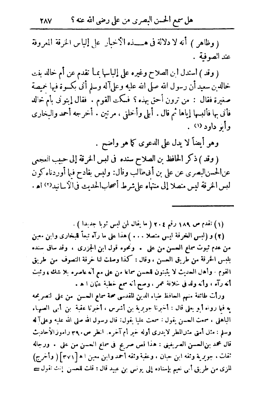 (¬2) و (لبس الخرقة ليس متصلا ... ) هذا على ما رآه تبعا للبخارى وابن معين من عدم ثبوت سماع الحسن من على. ونحوه قول ابن الجزرى، وقد ساق سنده بلبس الخرقة من طريق الحسن، وقال: كذا وصلت لنا خرقة التصوف من طريق القوم، وأهل الحديث لا يثبتون للحسن سماعا من على مع انه عاصره بلا شك، يثبت أنه رآه، وأنه ولد فى خلافة عمر ن وصح أنه سمع خطبة عثمان أهـ.
