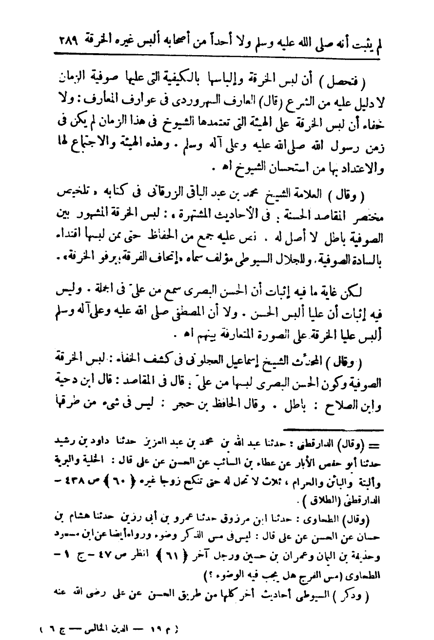 (وقال) المحدث الشيخ إسماعيل العجلونى فى كشف الخفاء: لبس الخرقة الصوفية وكون الحسن البصرى لبسها من على: قال فى المقاصد: قال ابن دحية وابن الصلاح: باطل. وقال الحافظ بن حجر: ليس فى شئ من طرقها
