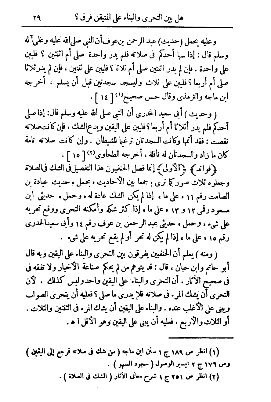 (ومنه) يعلم أن الحنفيين يفرقون بين التحرى والبناء على اليقين وبه قال أبو حاتم وابن حيان، قال: قد يتوهم من لم يحكم صناعة الأخبار ولا تفقه فى صحيح الآثار، أن التحرى والبناء على اليقين واحد ليس كذلك، لأن التحرى أن يشك المرء فى صلاته فلا يدرى ما صلى؟ فعليه أن يتحرى الصواب ويبنى على الأغلب عنده. والبناء على اليقين أن يشك المرء فى اثنتين والثلاث. أو الثلاث والأربع، فعليه أن يبنى على اليقين وهو الأقل أهـ.