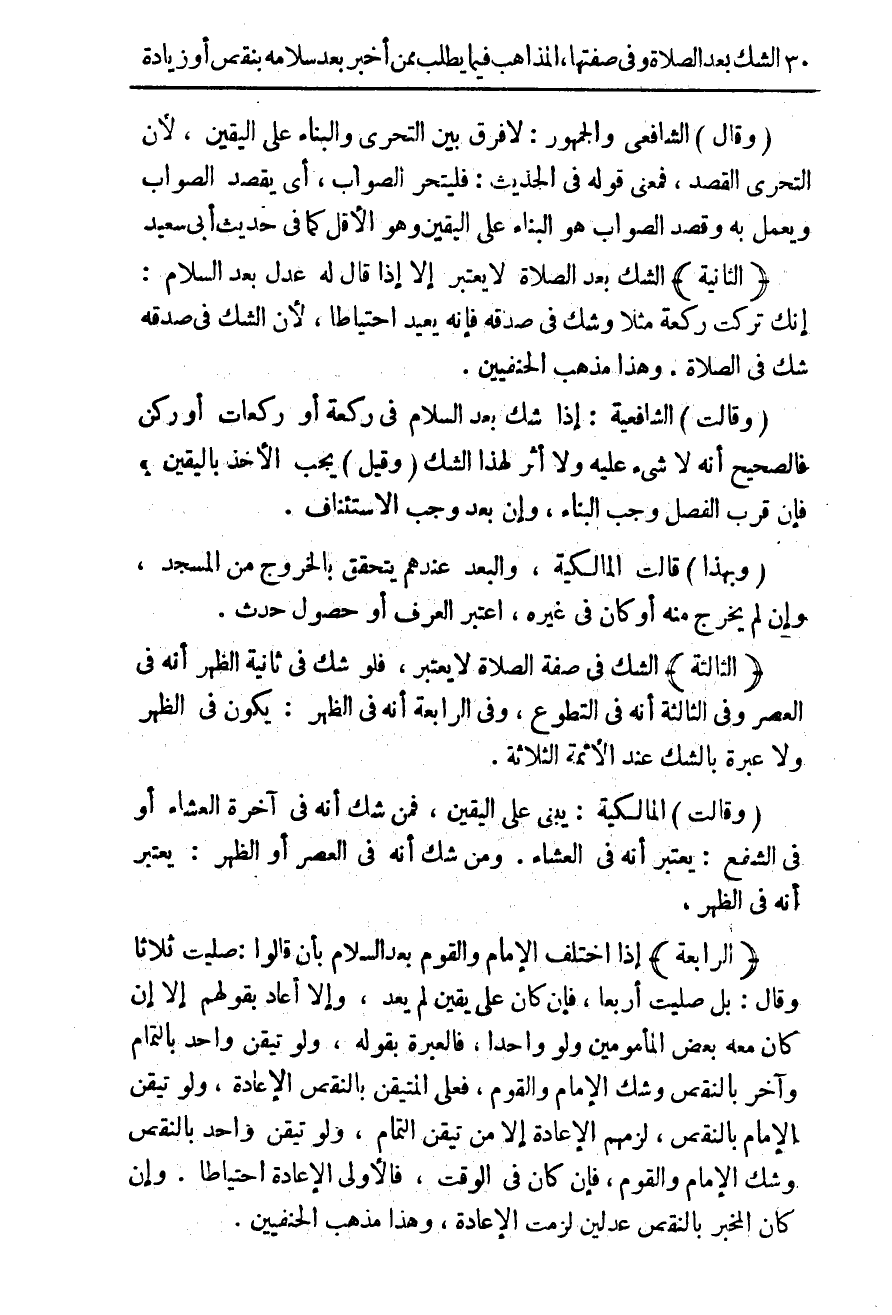 (الثالثة) الشك فى صفة الصلاة لا يعتبر، فلو شك فى ثانية الظهر أنه فى العصر وفى الثالثة أنه فى التطوع، وفى الرابعة أنه فى الظهر: يكون فى الظهر ولا عبرة بالشك عند الأئمة الثلاثة.