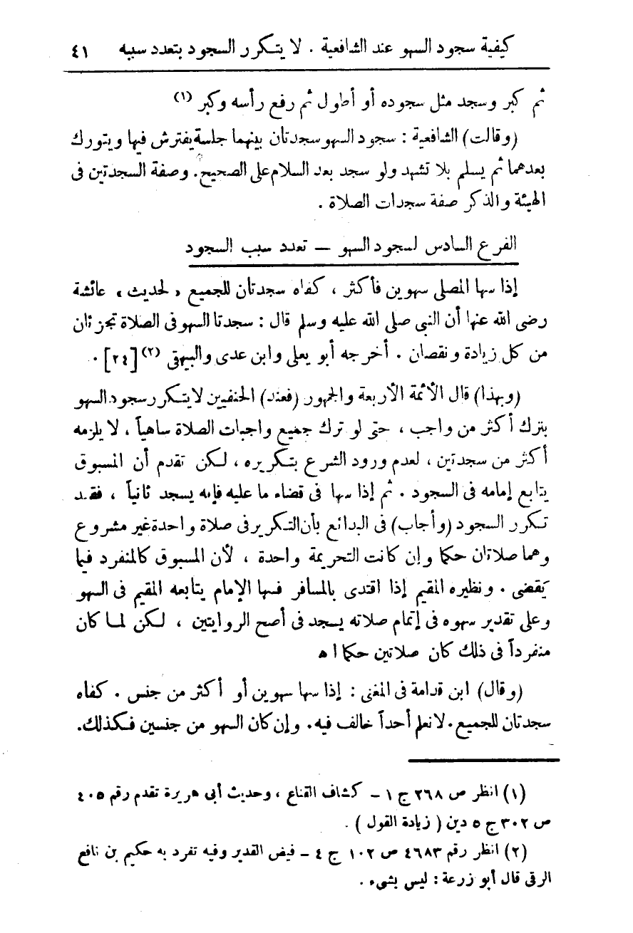 إذا سها المصلى سهوين فأكثر، كفاه سجدتان للجميع " لحديث " عائشة رضى الله عنها أن النبى صلى الله عليه وسلم قال: سجدتا السهو فى الصلاة تجزئان من كل زيادة ونقصان. أخرجه أبو يعلى وابن عدى والبيهقى (¬2) {24}.