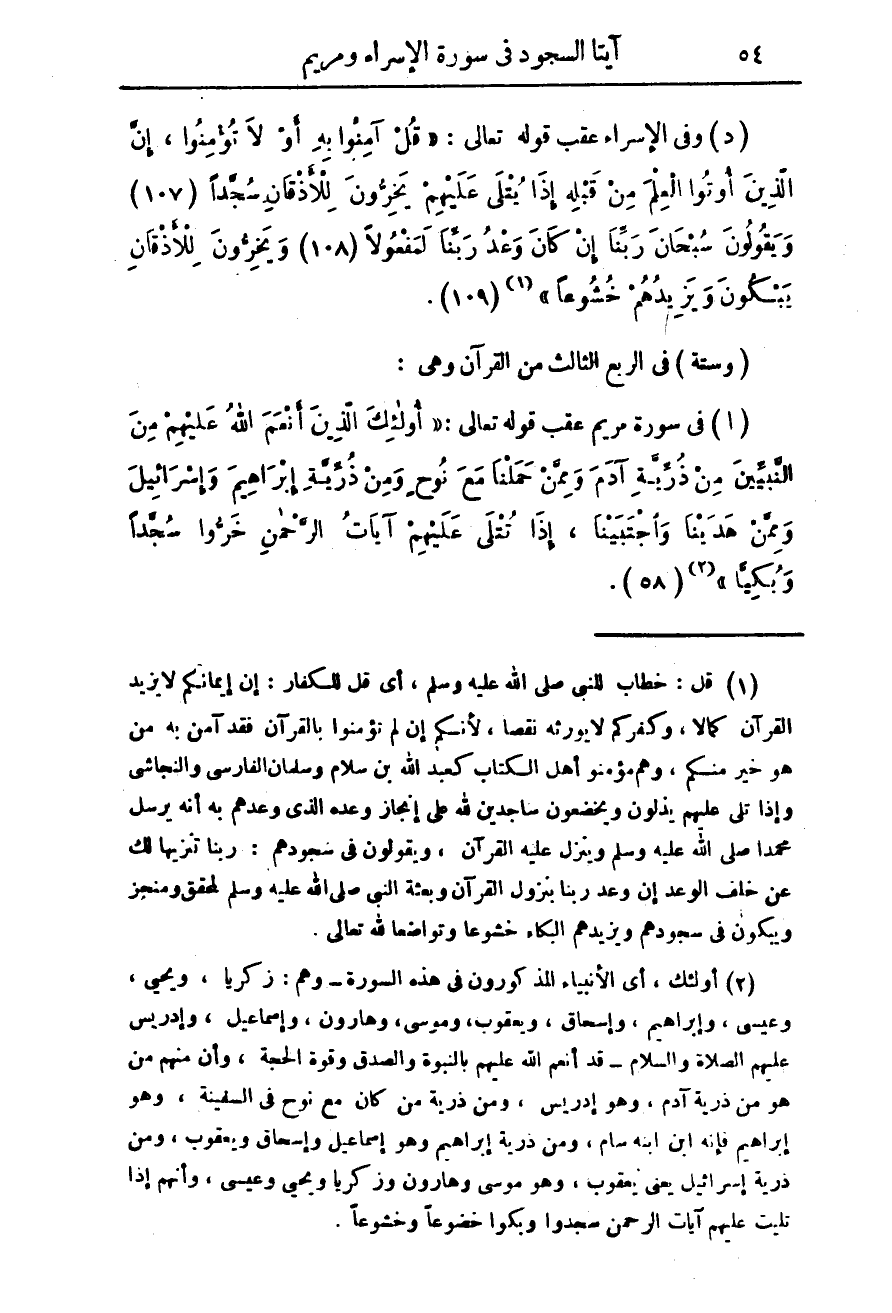 (د) وفى الإسراء عقب قوله تعالى: {قُلْ آمِنُواْ بِهِ أَوْ لاَ تُؤْمِنُواْ، إِنَّ الَّذِينَ أُوتُواْ الْعِلْمَ مِن قَبْلِهِ إِذَا يُتْلَى عَلَيْهِمْ يَخِرُّونَ لِلأَذْقَانِ سُجَّداً {107} وَيَقُولُونَ سُبْحَانَ رَبِّنَا إِن كَانَ وَعْدُ رَبِّنَا لَمَفْعُولاً {108} وَيَخِرُّونَ لِلأَذْقَانِ يَبْكُونَ وَيَزِيدُهُمْ خُشُوعاً} {109} (¬1)