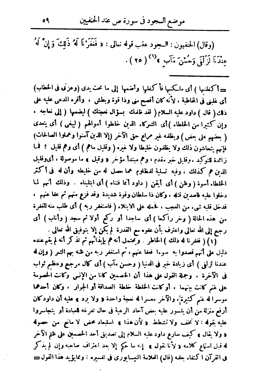 (وقال) الحنفيون: السجود عقب قوله تعالى: {فَغَفَرْنَا لَهُ ذَلِكَ وَإِنَّ لَهُ عِندَنَا لَزُلْفَى وَحُسْنَ مَآبٍ} {25} (¬1)