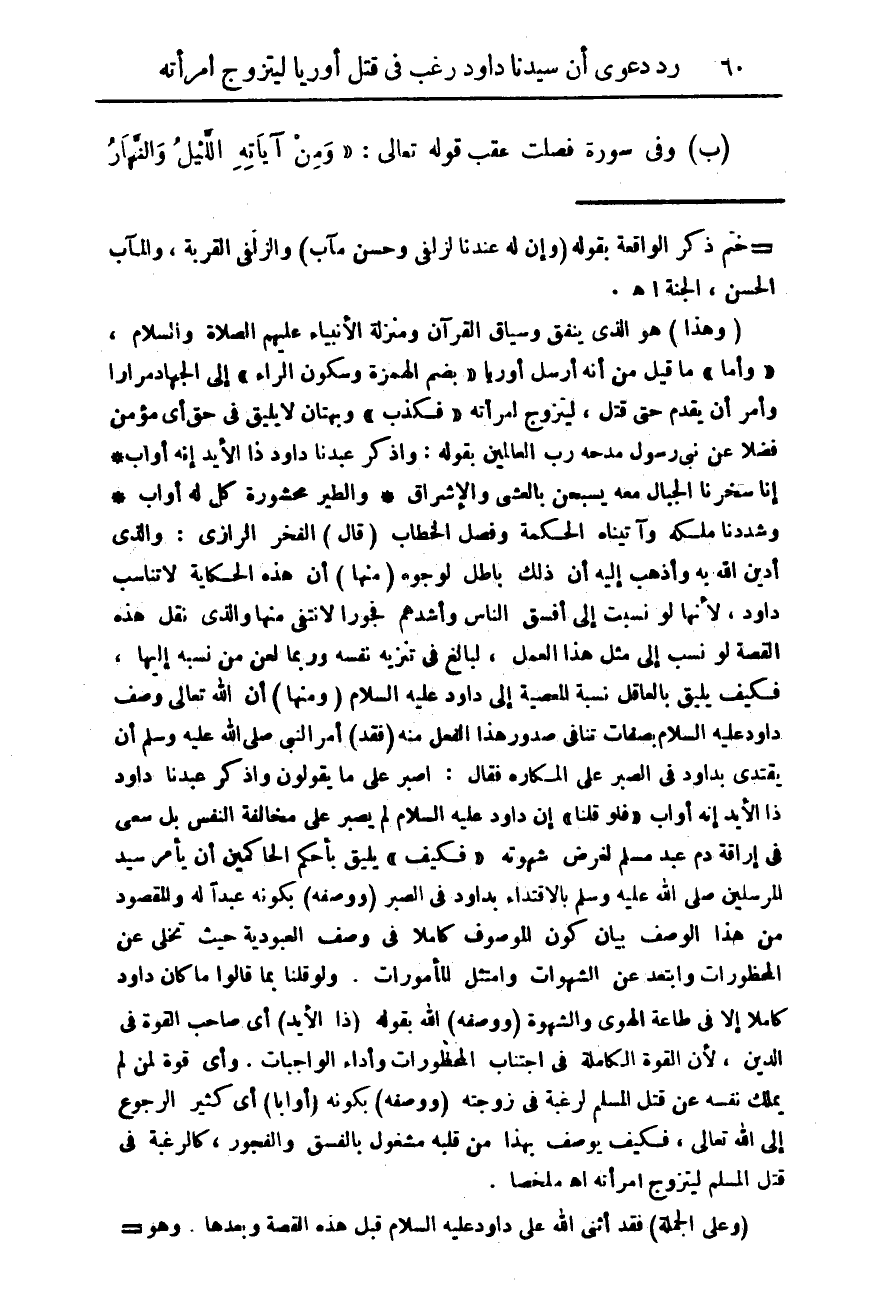 (وهذا) هو الذى بنفق وسياق القرىن ومنزلة الأنبياء عليهم الصلاة والسلام، " وأما " ما قيل من أنه أرسل أوريا ط بضم الهمزة وسكون الراء " إلى الجهاد مرارا وأمر أن يقدم حتى قتل، ليتزوج أمراته " فكذب " وبهتان لا يليق فى حق أى مؤمن فضلا عن نبى رسول مدحه رب العالمين بقوله: واذكر عبدنا داود ذا الإيد إنه أواب * إنا سخرنا الجبال معه يسبحن بالعشى والإشراق * والطير محشورة كل له أواب * وشددنا ملكه وآتيناه الحكمة وفصل الخطاب (قال) الفخر الرازى: والذى أدين الله به وأذهب إليه أن ذلك باطل لودوه (منها) أن هذه الحكاية لا تناسب داود، لأنها لو نسيت إلى افسق الناس واشدهم فجورا لا نتفى منها والذى نقل هذه القصة لو نسب إلى مثل هذا العمل، لبالغ فى تنزيه نفسه وربما لعن من نسبه إليها، فكيف يليق بالعاقل مسبة المعصية إلى داود عليه السلام (ومنها أن الله تعالى وصف داود عليه السلام بصفات تنافى صدور هذا الفعل منه (فقد) امر النبى صلى الله عليه وسلم أن يقتدى بداود فى الصبر على المكاره فقال: اصبر على ما يقولون واذكر عبدنا داود ذا الأيد إنه أواب ط فلو قلنا " إن داود عليه السلام لم يصبر على مخالفة النفس بل سعى فى غراقة دم عبد مسلم لغرض شهوته " فكيف " يليق باحكم الحاكمين أن يأمر سيد المرسلين صلى الله عليه وسلم بالاقتداء بداود فى الصبر (ووصفه) بكونه عبد له والمقصود من هذا الوصف بيان كون الموصوف كاملا فى وصف العبودية حيث تخلى عن المحظورات وابتعد عن الشهوات وامتثل المامورات. ولو قلنا بما قالوا ما كان داود كاملا إلا فى طاعة الهوى والشهوة (ووصفه) الله بقوله (ذا الايد) أى صاحب القوة فى الدين، لأن القوة الكاملة فى اجتناب المحظورات وأداء الواجبات. وأى قوة لمن لم يملك نفسه عن قتل المسلم لرغبة فى زوجته (ووصفه) بكونه (أوابا) أى كثير الرجوع إلى الله تعالى ن فكيف يوصف بهذا من قلبه مشغول بالفسق والفجور، كالرغبة فى قتل المسلم ليتزوج أمراته أهـ ملخصا