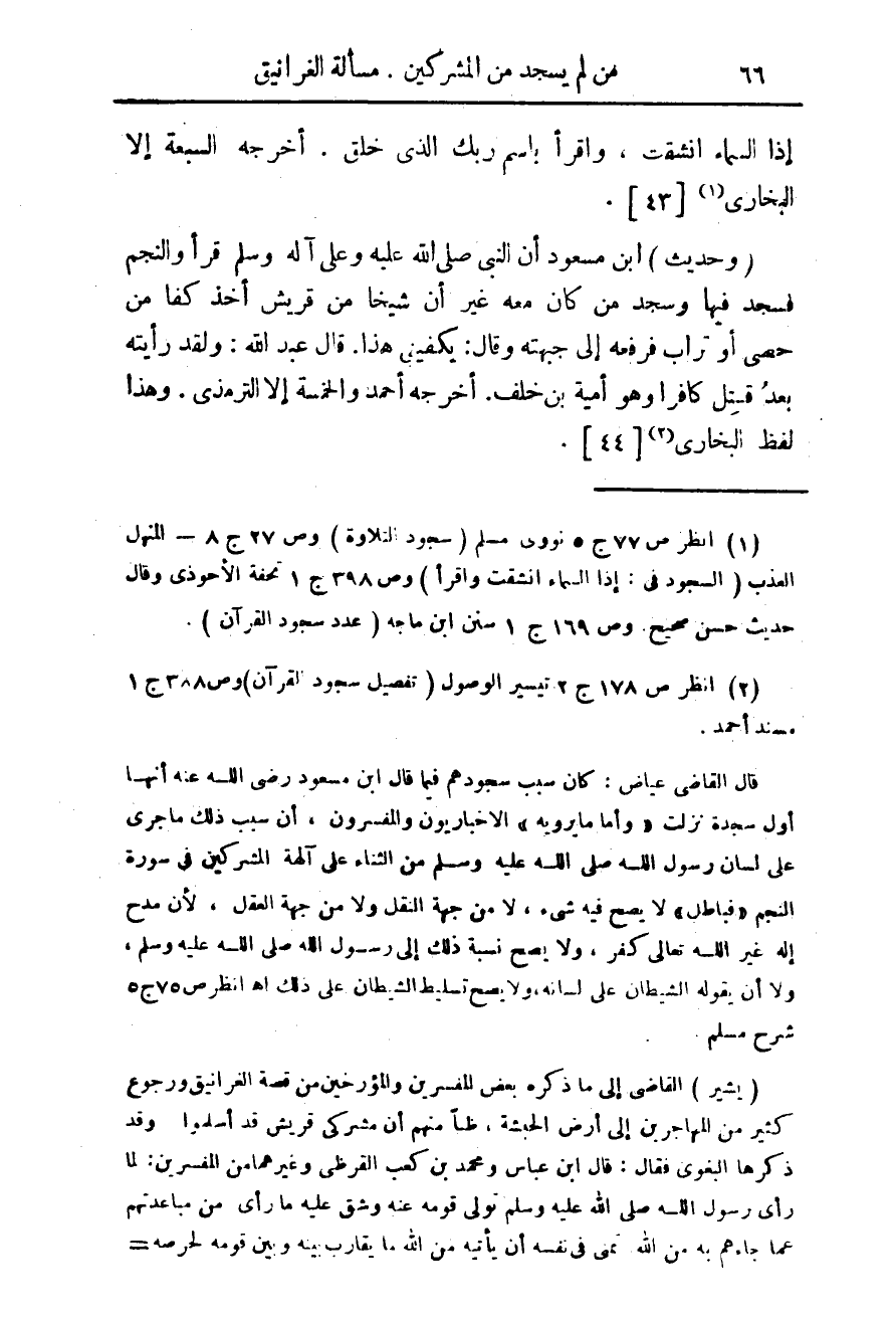 (يشير) القاضى إلى ما ذكره بعض المفسرين والمؤرخين من قصة الغرانيق ورجوع كثير من المهاجرين إلى ارض الحبشة، ظا منهم أن مشركى قربش قد اسلموا وقد ذكرها البغوى فقال: قال ابن عباس ومحمد بن كعب القرظى وغيرهما من المفسرين: لما راى رسول الله صلى الله عليه وسلم تولى قومه عنه وشق عليه ما رأى من مباعدتهم عما جاءهم به من الله تمنى فى نفسه أن ياتيه من الله ما يقارب بينه وبين قومه لحرصه =