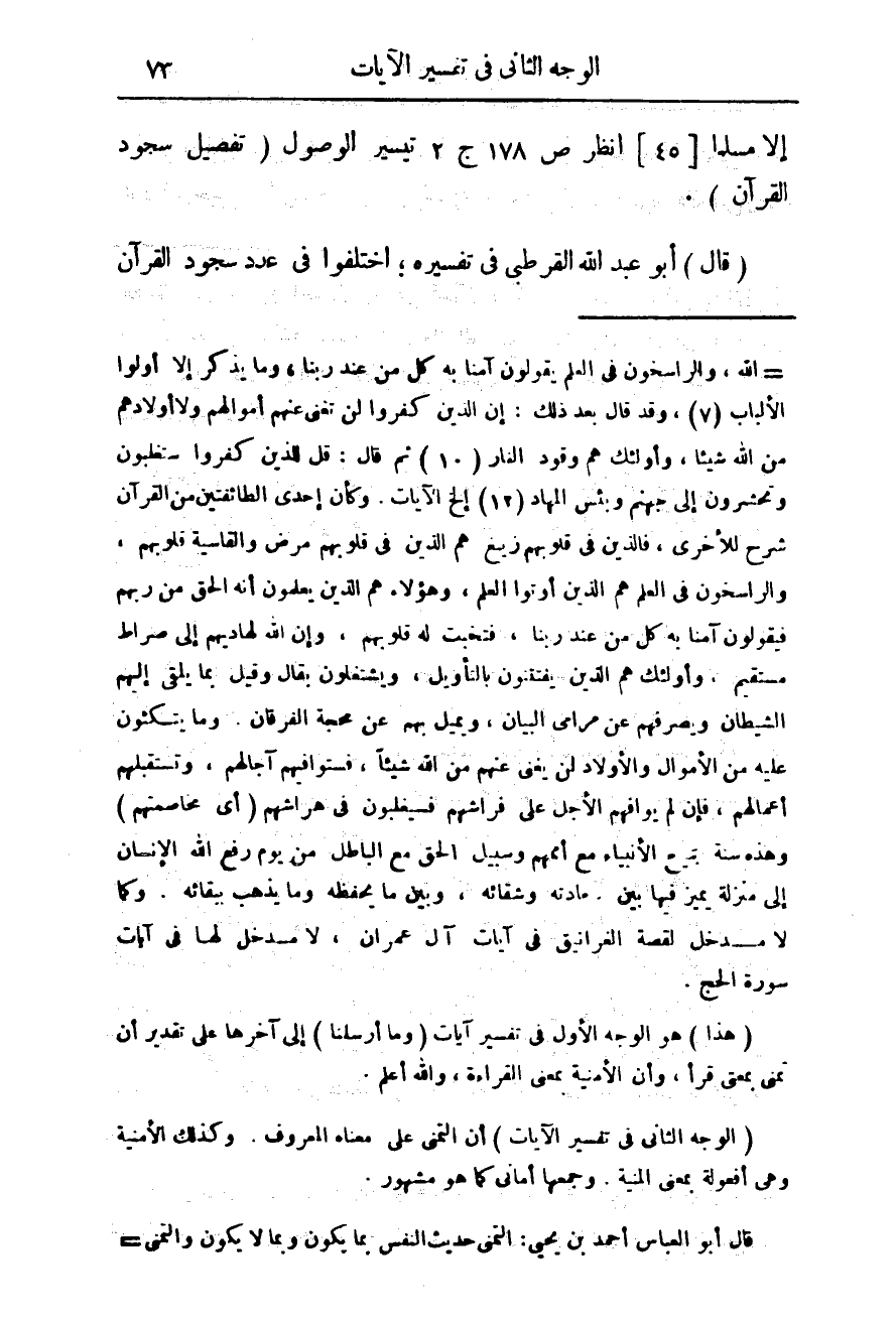 (الوجه الثانى فى تفسير الايات) أن التمنى على معناه المعروف. وكذلك الأمنية وهى أفعوله بمعنى. وجمعها أمانى كما هو مشهور.