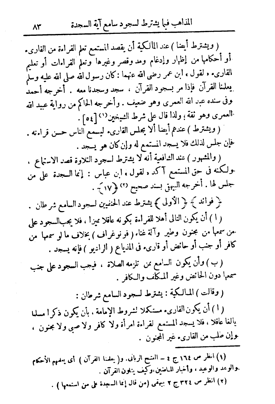 (ويشترط أيضا) عند المالكية أن القصد المستمع تعلم القراءة من القارئ أو أحكامها من إظهار وإدغام ومد وقصر وغيرها وتعلم القراءات أو تعليم القارئ " لقول " ابن عمر رضى الله عنهما: كان رسول الله صلى الله عليه وسلم يعلمنا القرآن فإذا مر بسجود القرآن، سجد وسجدنا معه. أخرجه أحمد وفى سنده عبد الله العمرى وهو ضعيف. وأخرجه الحاكم من رواية عبيد الله العمرى وهو ثقة، لذا قال على شرط الشيخين (¬1) {54}