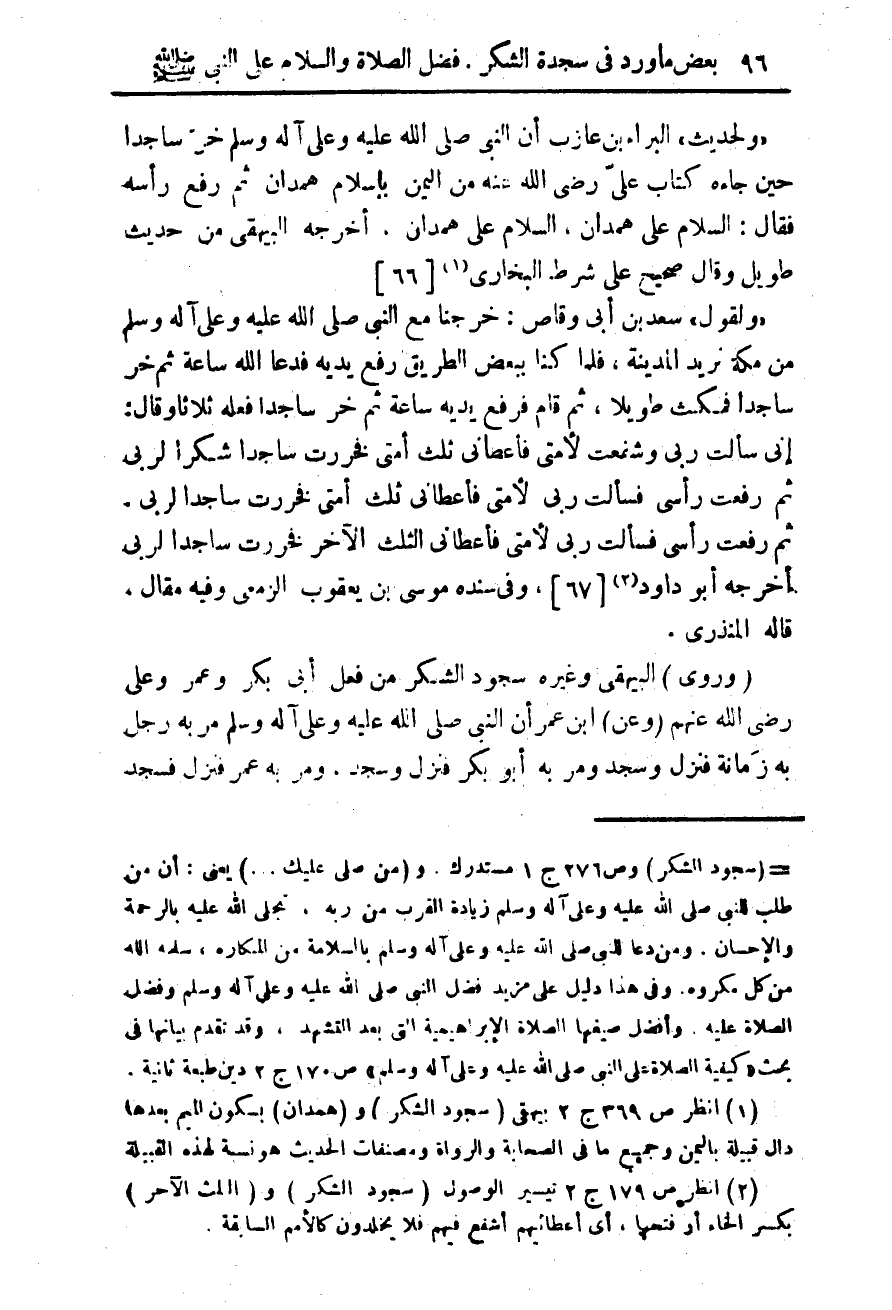 " ولحديث " البراء بن عازب أن النبى صلى الله عليه وعلى آله وسلم خر ساجدا حين جاءه كتاب على رضى الله عنه من ليمن بإسلام همدان ثم رفع راسه فقال: السلام على همدان، السلام على همدان. أخرجه