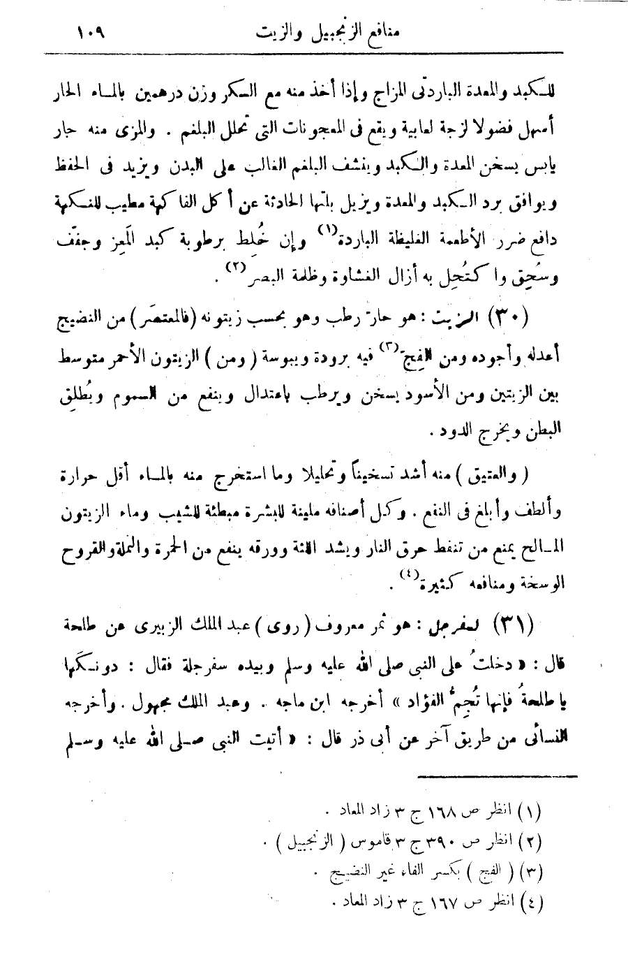 (30) الزيت: هو حار رطب وهو بحسب زيتونه (فالمعتصر) من النضيج أعدله وأجوده ومن الفج (¬3) فيه برودة ويبوسة (ومن) الزيتون الأحمر متوسط بين الزيتين ومن الأسود يسخن ويرطب باعتدال وينفع من السموم ويطلق البطن ويخرج الدود.