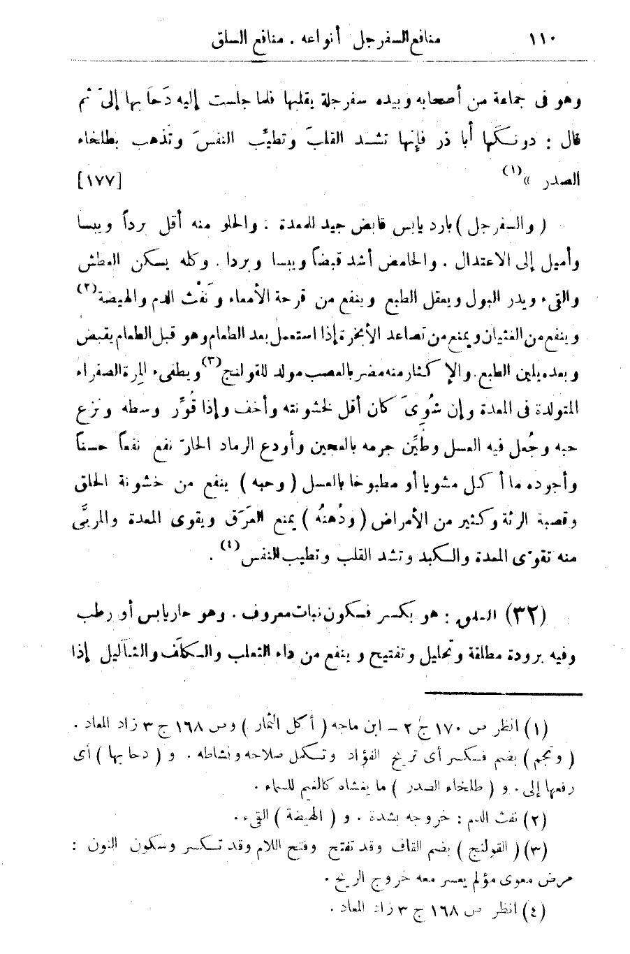 (والسفرجلة) بارد يابس قابض جيد للمعدة. والحلو منه اقل بردا ويبسا وأميل إلى الأعتدال. والحامض أشد قبضا ويبسا وبردا. وكله يسكن العطش والقيء ويدر البول ويعقل الطبع وينفع من قرحة الأمعاء ونفث الدم والهيضة (¬2)