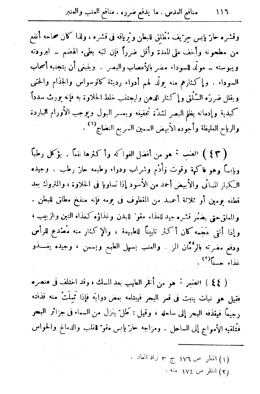 (44) العنبر: هو من افخر الطيب بعد المسك، وقد اختلف في عنصره فقيل هو نبات ينبت في قمر البحر فيبتلمه بعض دوابه فإذا ثملت منه قذفته رجيعا فيقذفه البحر إلى ساحله، وقيل: طل ينزل من السماء في جزائر البحر فتلقيه الأمواج إلى الساحل. ومزاجه حار يابس مقو للقلب والدماغ والحواس