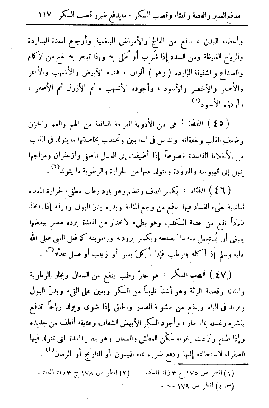 (47) قصب السكر: هو حار رطب ينفع من السعال ويحلو الرطوبة والمثانة وقصبة الرئة وهو أشد تليينا من السكر ويعين على القيء ويدر البول ويزيد في الباه وينفع من خشونة الصدر والحلق إذا شوى ويولد رياحا تدفع بقشر وغسله بماء حار، وأجود السكر الأبيض الشفاف وعتيقه ألطف من جديده وإذا طبخ ونزعت رغوته سكن العطش والسعال وهو يضر المعدة آلتي تتولد فيها الصفراء لاستحالته إليها ودفع ضرره بماء الليمون أو النارنج أو الرمان (¬3).