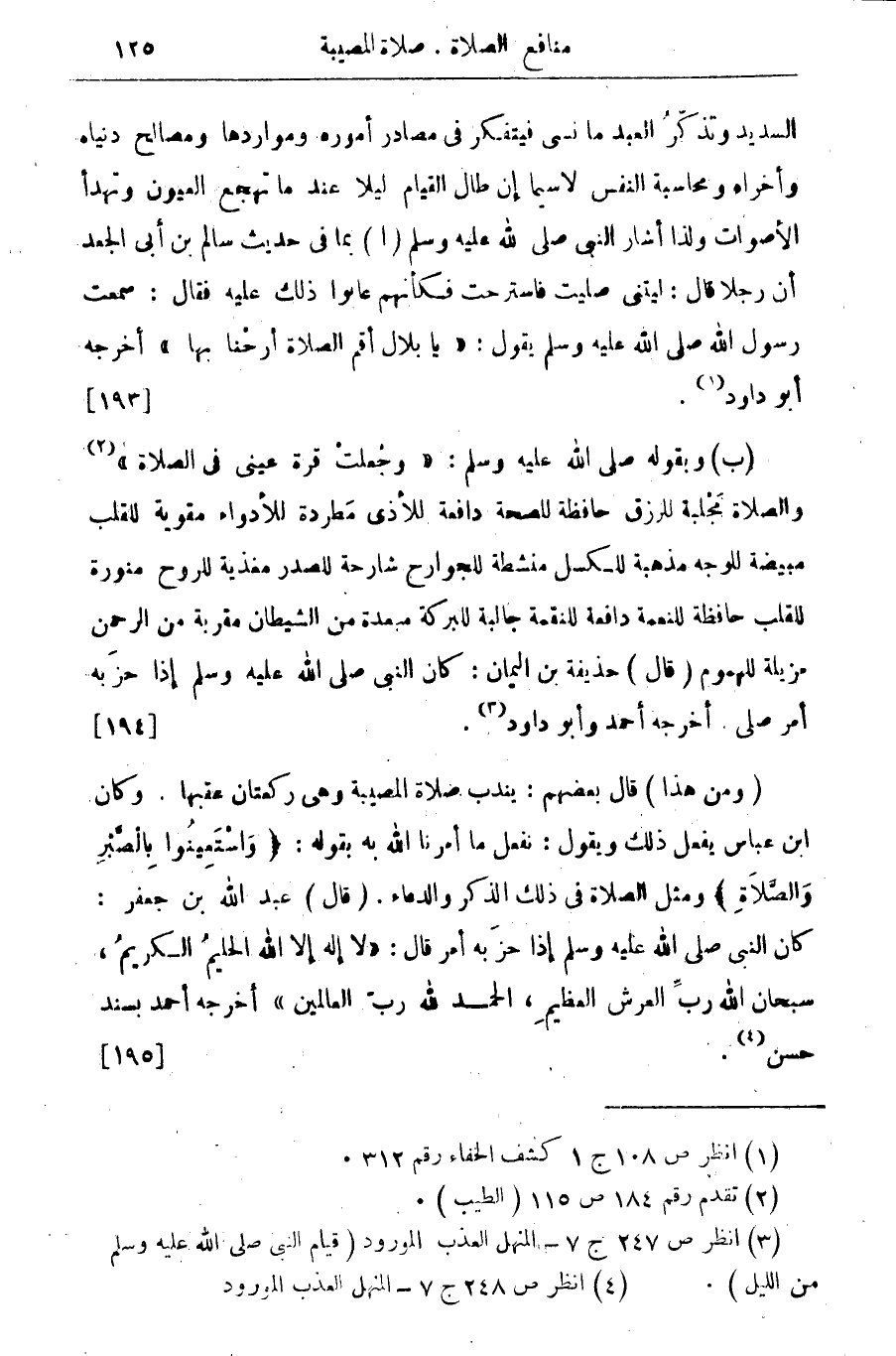 (ب) وبقوله صلى الله عليه وسلم: " وجعلت قرة عيني في الصلاة " (¬2) والصلاة مجلبة للرزق حافظة للصحة دافعة للأذى مطردة للأدواء مقوية للقلب مبيضة للوجه مذهبة للكسل منشطة للجوارح شارحة للصدر مغذية للروح منورة للقلب حافظة للنعمة دافعة للنقمة جالبة للبركة مبعدة من الشيطان مقربة من الرحمن مزيلة للهموم (قال) حذيفة بن اليمان: كان النبي صلى الله عليه وسلم إذا حزبه أمر صلى. اخرجه أحمد وأبو داود (¬3). {194}