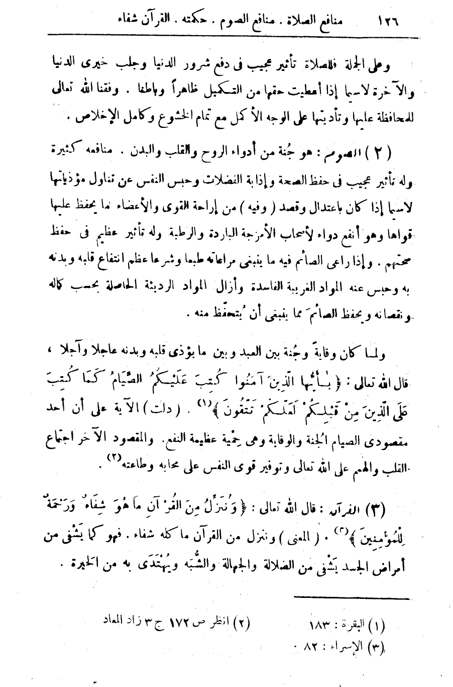 (2) الصوم: هو جنة من أدواء الروح والقلب والبدن. منافعه كثيرة وله تأثير عجيب في حفظ الصحة وإذابة الفضلات وحبس النفس عن تناول مؤدياتها لا سيما إذا كان باعتدال وقصد (وفيه) من إراحة القوى والأعضاء ما يحفظ عليها قواها وهو أنفع دواء لأصحاب الأمزجة الباردة والرطبة وله تأثير عظيم في حفظ صحتهم. وإذا راعى الصائم فيه ما ينبغي مراعاته طبعا وشرعا عظم انتفاع قلبه وبدنه به وحبس عنه المواد الغريبة الفاسدة وأزال المواد الرديئة الحاصلة بحسب كماله ونقصانه ويحفظ الصائم مما ينبغي أن يتحفظ منه.