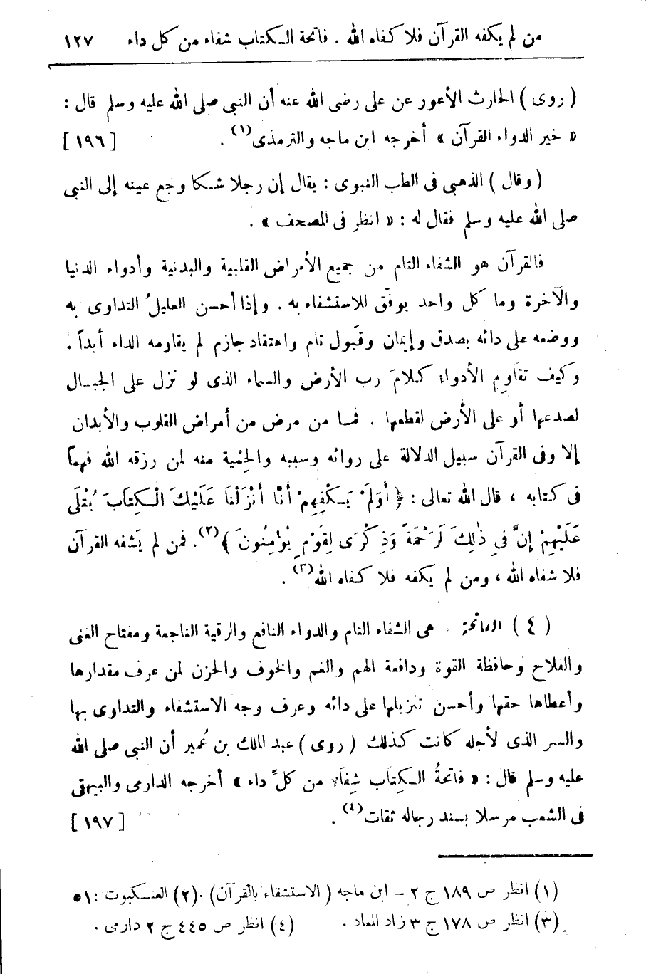 (4) الفاتحة: هي الشفاء التامم والدواء النافع والرقية الناجعة ومفتاح الغنى والفلاح وحافظة القوة ودافعة الهم والغم والخوف والحزن لمن عرق مقدارها وأعطاها حقها وأحسن تنزيلها على دائه وعرف وجه الاستشفاء والتداوى بها والسر الذي لأجله كانت كذلك (روى) عبد الملك بن عمير أن النبي صلى الله عليه وسلم قال: " فاتحة الكتاب شفاء من كل داء " اخرجه الدرامي والبيهقى في الشعب مرسلا بسند رجاله ثقات (¬4). {197}