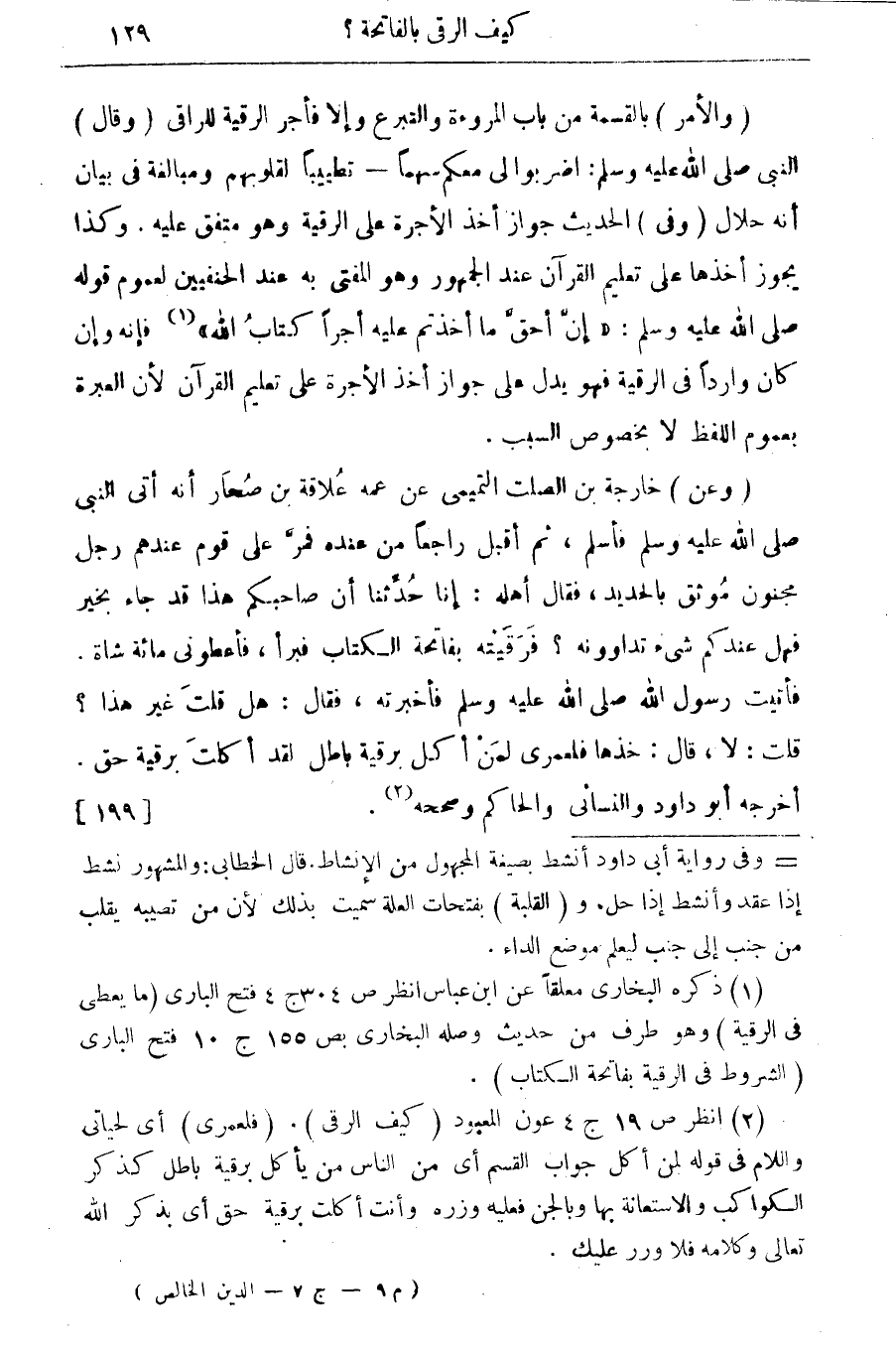 (وعن) خارجة بن الصلت التميمى عن عمه علاقة بن صحار أنه أتى النبي صلى الله عليه وسلم فاسلم، ثم اقبل راجعا من عنده فمر على قوم عندهم رجل مجنون موثق بالحديد، فقال أهله: إنا حدثنا أن صاحبكم هذا قد جاء بخير فهل عندكم شئ تداوونه؟ فرقيته بفاتحة الكتاب فبرأ، فأعطوني مائة شاة. فأتيت رسول الله صلى الله عليه وسلم فأخبرته، فقال: هل قلت غير هذا؟ قلت: لا، قال: خذها فلعمري لمن أكل برقية باطل لقد أكلت برقية حق أخرجه أبو داود والنسائي والحاكم وصححه. (¬2) {199}