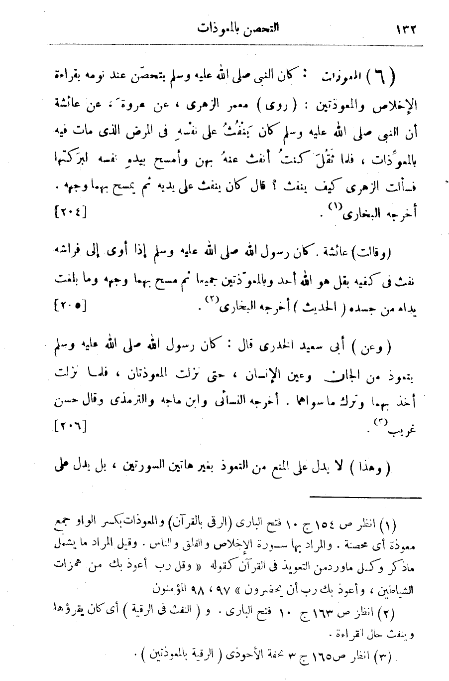 (¬1) انظر ص 154 ج 10 فتح البارى (الرقى بالقرآن) والمعوذات بكسر الواو جمع معوذة أى محصنة. والمراد بها سورة الإخلاص والفلق والناس. وقيل المراد ما يشمل ما ذكر وكل ما ورد من التعويذ فى القرآن كقوله " وقل رب أعوذ بك من همزات الشياطين، وأعوذ بك أن يحضرون " 79 و 98 المؤمنون