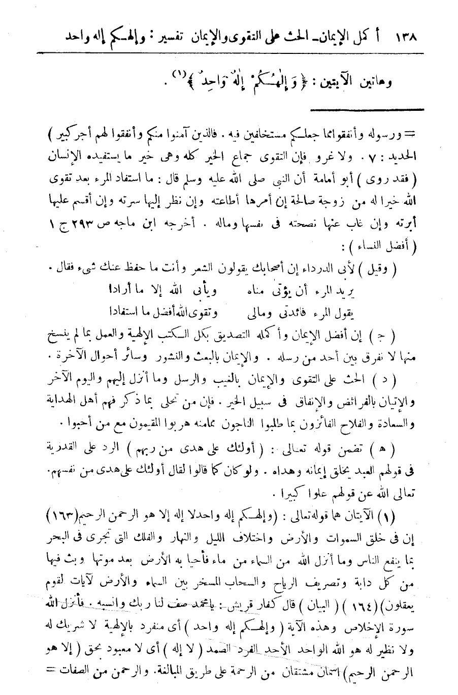 (¬1) الايتان هما قوله تعالى: (والهكم اله واحد لا اله الا هو الرحمن الرحيم (163) (إن فى خلق السموات والأرض واختلاف الليل والنهار والفلك التى تجرى فى البحر بما بنفع الناس وما أنزل الله من السماء من ماء فأحيا به الأرض بعد موتها وبث فيها من كل دابة وتصريف الرياح والسحاب المسخر بين السماء والرض لايات لقوم يعقلون) 164) (البيان) قال كفار قريش: يا محمد صف لنا ربك وانسبه. فأنزل الله سورة الإخلاص وهذه الآية (وإلهكم اله واحد) أى منفرد بالإلهية لا شريك له ولا نظير له هو الله الواحد الأحد الفرد الصمد (لا اله) أى لا معبود بحق (إلا هو الرحمن الرحيم) اسمان مشتقان من الرحمة على طريق المبالغة. والرحمن من الصفات =