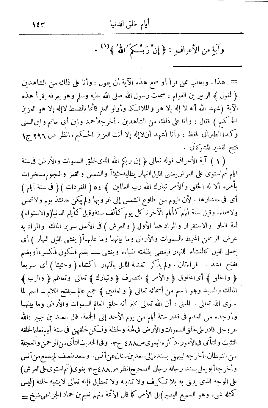 (¬1) (آية العراف قوله تعالى: " ان ربكم الله الذى خلق السموات والرض فى ستة ايام ثم استوىعلى العرش يغشى الليل والنهار يطلبه حثيثا والشمس والقمر والنجوم مسخرات بامره ألا له الخلق والأمر تبارك الله رب العالمين) 54 (المفردات (فى ستة ايام) أى فى مقدارها. لأن اليوم من طلوع الشمس الى غروبها ولم يكن حينئذ يوم ولا شمس ولا سماء. وقيل ستة أيام كأيام الآخرة كل يوم كألف سنة وقيل كايام الدنيا (والاستواء) لغة العلو والاستقرار والمراد هنا الأول (والعرش) فى الأصل سرير الملك والمراد به عرش الرحمن المحيط بالسموات والأرض وما بينهما وما عليهما (يغشى- بضم فسكون فكسر، أو بضم ففتح فشد - قراءتان. ولم يذكر تغشية الليل بالنهار اكتفاء (وحثيثا) أى سريعا (والخلق) أى المخلوق (والأمر) التصرف (وتبارك) تعالى وتعاظم (والرب) المالك والسيد وهو اسم من اسمائه تعالى (والعالمين) جمع العالم والسموات والرض وما بينهما وأوجده من العالم فى قدر ستة ايام من يوم الاحد الى الجمعة. قال سعيد بن جبير: الله عز وجل قادر على خلق السموات والأرض فى لمحة ولحظة ولكن خلقهن فى ستة ايام تعليما لخلقه التثبت والتأبى فى الأمور ذكره البغوى ص 488 ج 3. وفى الحديث التأبنى من الرحمن والعجلة من الشيطان. أخرجه البيهقى بسنده الى سعد بن سنان عن انس. وسعد ضعيف لم يسمع من انس على الوجه الذى يليق به بلا تكييف ولا تشبيه ولا تعطيل فإنه تعالى لا يشبه خلقه (ليس كمثله شئ وهو السميع البصير) بل الامر كما قاله الأئمة منهم نعيم بن حماد الجزاعى شيخ البخارى قال: من شبه الله بخلقه كفر ومن جحد ما وصف الله به نفسه فقد كفر وليس فيما وصف الله به نفسه ولا رسوله تشبيه .. فمن أثبت لله تعالى ماوردت به الآيات الصريحة والأخبار الصحيحة على الوجه الذى يليق بجلال الله ونفى عن اللع تعالى النقائص فقد سلك سبيل الهدى. وقوله تعالى (يغشى الليل النهار يطلبه حثيثا) أى يذهب أحدهما ظلام هذا بضياء هذا وضياء ها بظلمة هذا وكل منهما بطلب الآخر طلبا سريعا لا يتأخر عنه بل اذا ذهب احدهما جاء الآخر قال تعالى (لا الشمس ينبغى لها أن تدرك القمر ولا الليل سابق النهار وكل فى فلك يسبحون) فقوله: ولا الليل سابق النهار. أى لا يفوته بوقت يتأخر عنه بل هو فى أثره بلا واسطة بينهما. ولهذا قال: يطلبه حثيثا (والشمس والقمر والنجوم مسخرات بأمره) أى أن الجميع تحت قهره وتسخيره ومشيئته ولهذا قال (ألا له الخلق والأمر) أى له الملك والتصرف (تبارك الله رب العالمين) كما قال تعالى (تبارك الذى جعل فى السماء بروجا وجعل فيها سراجا وقمرا منيرا).