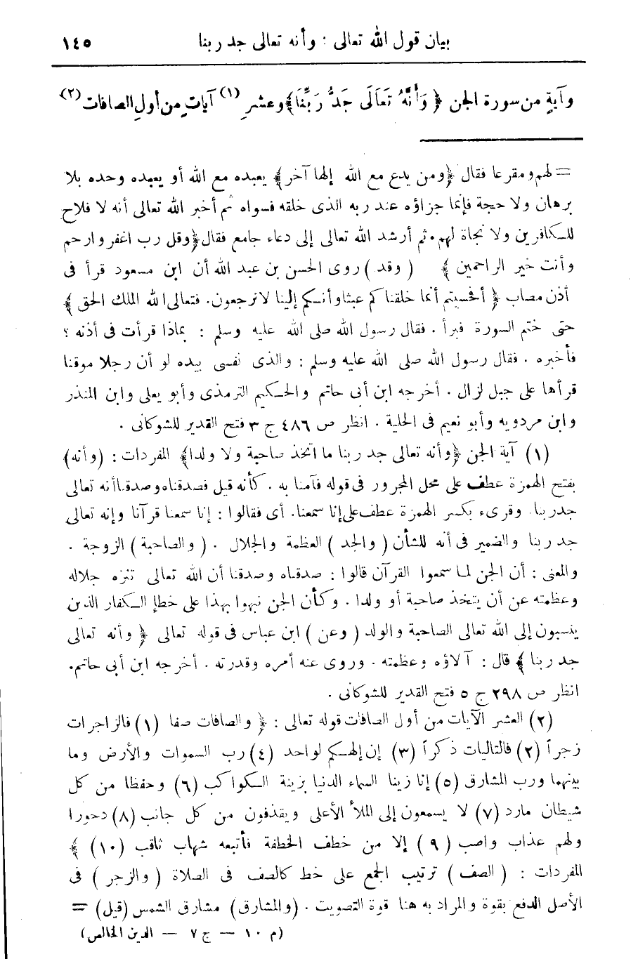 (¬1) آية الجن " وأنه تعالى جد ربنا ما اتخذ صاحبه ولا ولدا " المفردات: (وأنه) بفتح الهمزة عطف على محل المجرور فى قوله فآمنا به. كأنه قيل فصدقناه وصدقنا أنه تعالى جد ربنا وقرئ بكسر الهمزة عطف على انا سمعنا. اى فقالوا: انا سمعنا قرآنا وأنه تعالى جد ربنا والضمير فى أنه للشأن (والجد) العظمة والجلال. (والصاحبة) الزوجة.