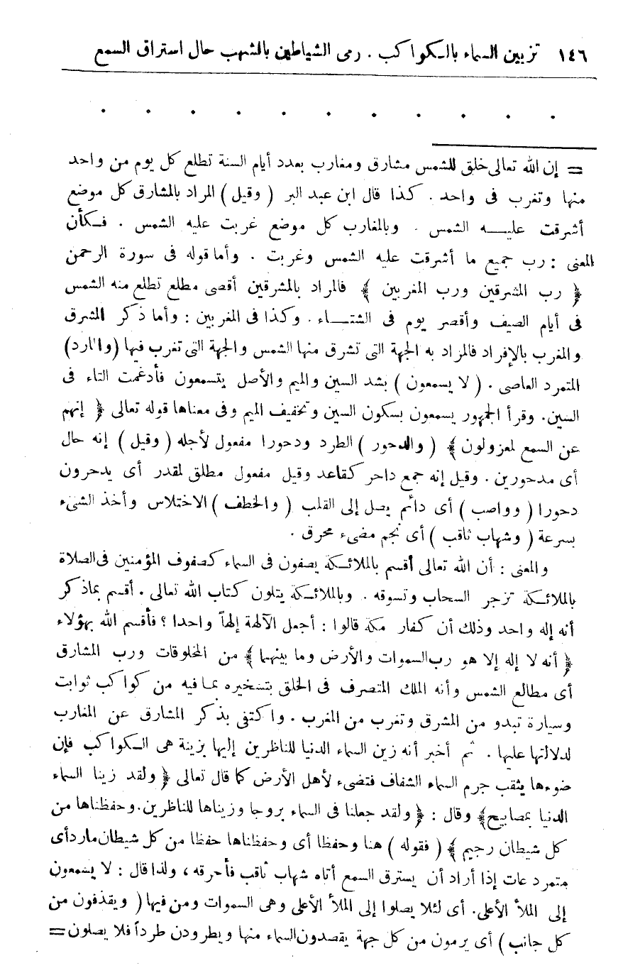 = إن الله تعالى خلق للشمس مشارق ومغارب بعدد ايام السنة تطلع كل يوم من واحد منها وتغرب فى واحد. كذا قال ابن عبد البر (وقيل) المراد بالمشارق كل موضع اشرقت عليه الشمس. وبالمغارب كل موضع غربت عليه الشمس. فكأن المعنى: رب جميع ما اشرقت عليه الشمس وغربت. وأما قوله فى سورة الرحمن " رب المشرقين والمغربين" فالمراد بالمشرقين أقصى مطلع تطلع منه الشمس فى ايام الصيف وأقصر يوم فى الشتاء وكذا فى المغربين: وأما ذكر المشرق والمغرب بالإفراد فالمراد به الجهة التى تشرق منها الشمس والجهة التى تغرب فيها (والمراد) المتمرد العاصى. (لا سمعون) بشد السين والميم والأصل يتسمعون فإدغمت التاء فى السين. وقرأ الجمهور يسمعون بسكون السين وتخفيف الميم وفى معناها قوله تعالى " إنهم عن السمع لمعزولون " (والدحور) الطرد ودحورا مفعول لاجله (وقيل) إنه حال أى مدحورين. وقيل إنه جمع داحر كقاعد وقيل مفعولا مطلق لمقدر أى يدحرون دحورا (وواصب) اى دائم يصل الى القلب (والخطف) الاختلاس واخذ الشئ بسرعة (وشهاب ثاقب) أى نجم مضئ محرق.