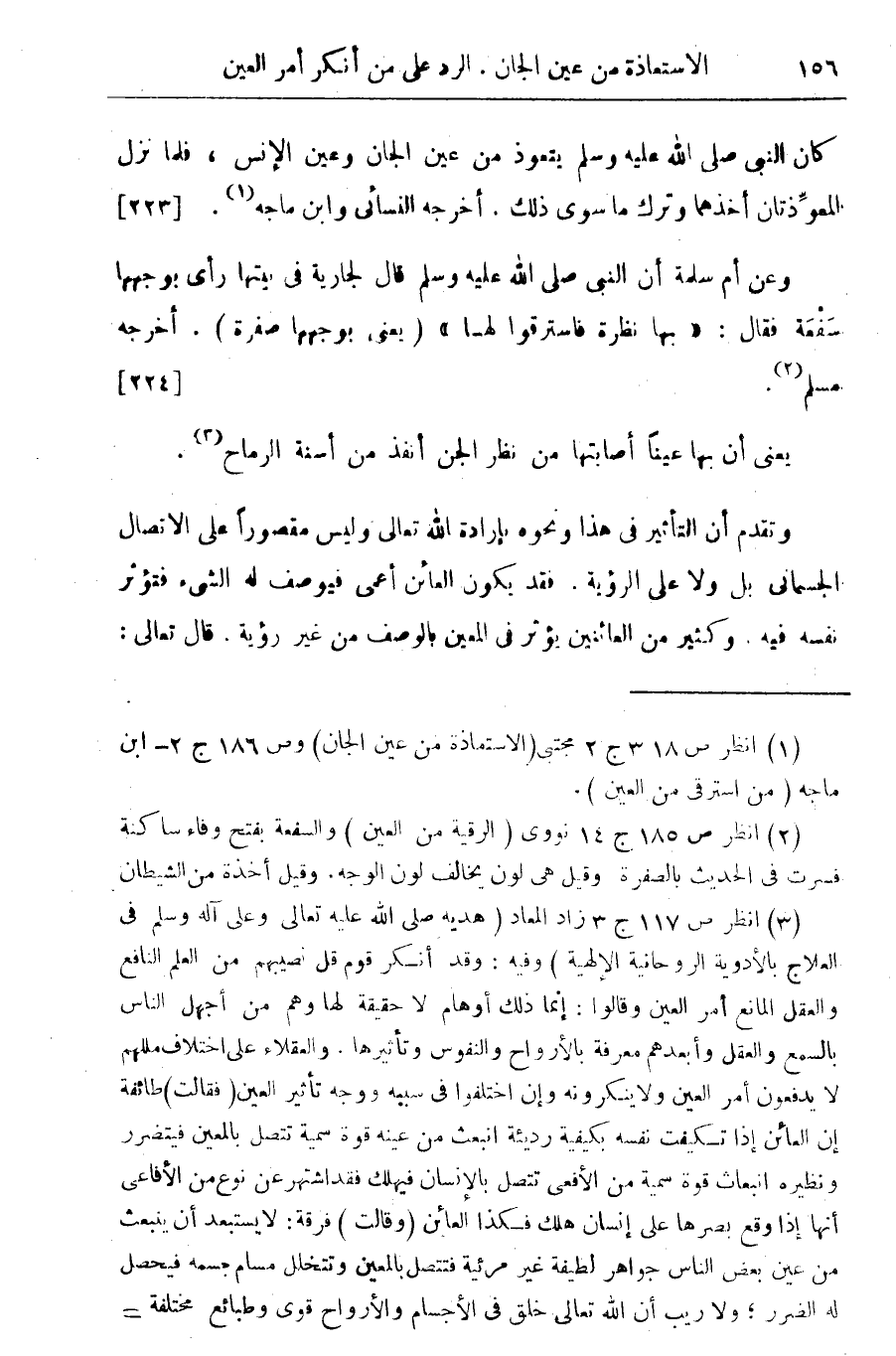 (¬3) انظر ص 117 ج 3 زاد المعاد (هدية صلى الله عليه وسلم فى العلاج بالادوية الروحانية الإلهية) وفيه: وقد انكر قوم قل نصيبهم من العلم النافع والعقل المانع أمر العين وقالوا: إنما ذلك أوهام لا حقيقة لها وهم من أجهل الناس بالسمع والعقل وابعدهم معرفة بالارواح والنفوس وتأثيرها. والعقلاء على اختلاف مللم لا يدفعون أمر العين ولا ينكرونه وإن اختلفوا فى سببه ووجه تأثير العين (فقالت) طائفه إن العائن إذا تكيفت نفسه بكيفية رديئة انبعث من عينه قوة سمية تتصل بالمعين فيتضرر ونظيره انبعاث قوة سمية من الأفعى تتصل الإنسان فيهلك فقد اشتهر عن نوع من الأفاعى أنها إذا وقع بصرها على إنسان هلك فكذا العائن (وقالت) فرقة: لا يستبعد أنينبعث من عين بعض الناس جواهر لطيفة غير مرئية فتتصل بالمعين وتتخلل مسام جسمه فيحصل له الضرر ن ولا ريب أن الله تعالى خلق فى الأجسام والرواح قوى وطبائع مختلفة وجعل فى كثير منها خواص وكيفيات مؤثرة فى الأجسام كما هو مشاهد محسوس فأنت ترى الوجه يحمر خجلا إذا نظراليه من يستحى منه، ويصفر خوفا عند نظر من يخافه وقد شاهد الناس من يسقم من النظر وتضعف قواه بواسطة تأثير الأرواح. والأرواح مختلفة ارتباطها بالعين ينسب الفعل إليها وليست هى الفاعلة بل التأثير للروح. والأرواح مختلفة فى طبائعها وقواها وخواصها فروح الحاسد مؤذية للمحسود أذى بينا لا ينكره إلا من هو خارج عن دائرة الإنسانية ولذا امر الله تعالى رسوله صلى الله عليه وسلم أن يستعيذ به من شر الحاسد (والحسد) اصله الإصابة بالعين فإن النفس الحاسدة تتكيف بكيفية خبيثة وتقابل المحسود فتؤثر فيه تلك الخاصية.